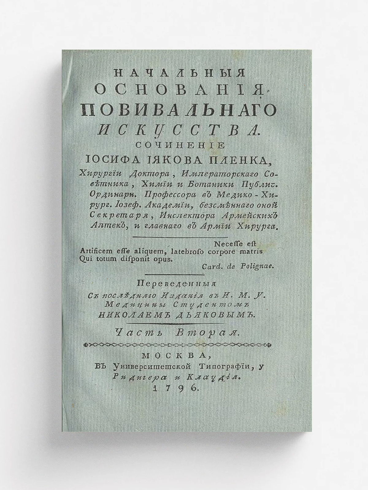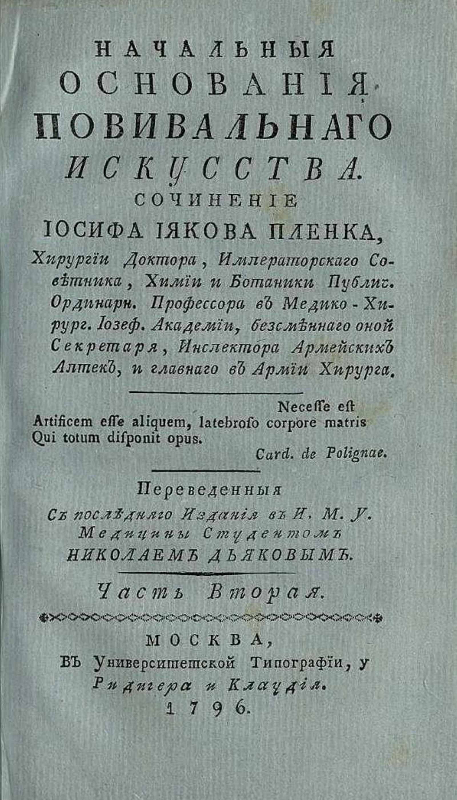 Пленк, Йозеф Якоб фон (1735–1807). Начальныя основания повивальнаго искусства. / Сочинение Иосифа Иякова Пленка, хирургии доктора, императорскаго советника, химии и ботаники публич. ординарн. профессора в Медико-хирург. Иозеф. академии, безсменнаго оной секретаря, инспектора армейских аптек, и главнаго в армии хирурга. ; Переведенныя с последняго издания в И[мп.] М[осковском] у[ниверситете] студентом Николаем Дьяковым. — Москва : Унив. тип., у Ридигера и Клаудия, 1796. — 8°. Ч.2. — IX, [2], 218, [3] с., 2 л. ил.
