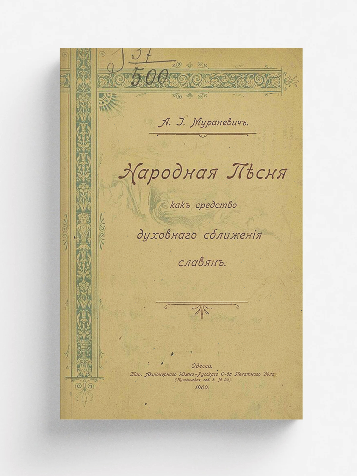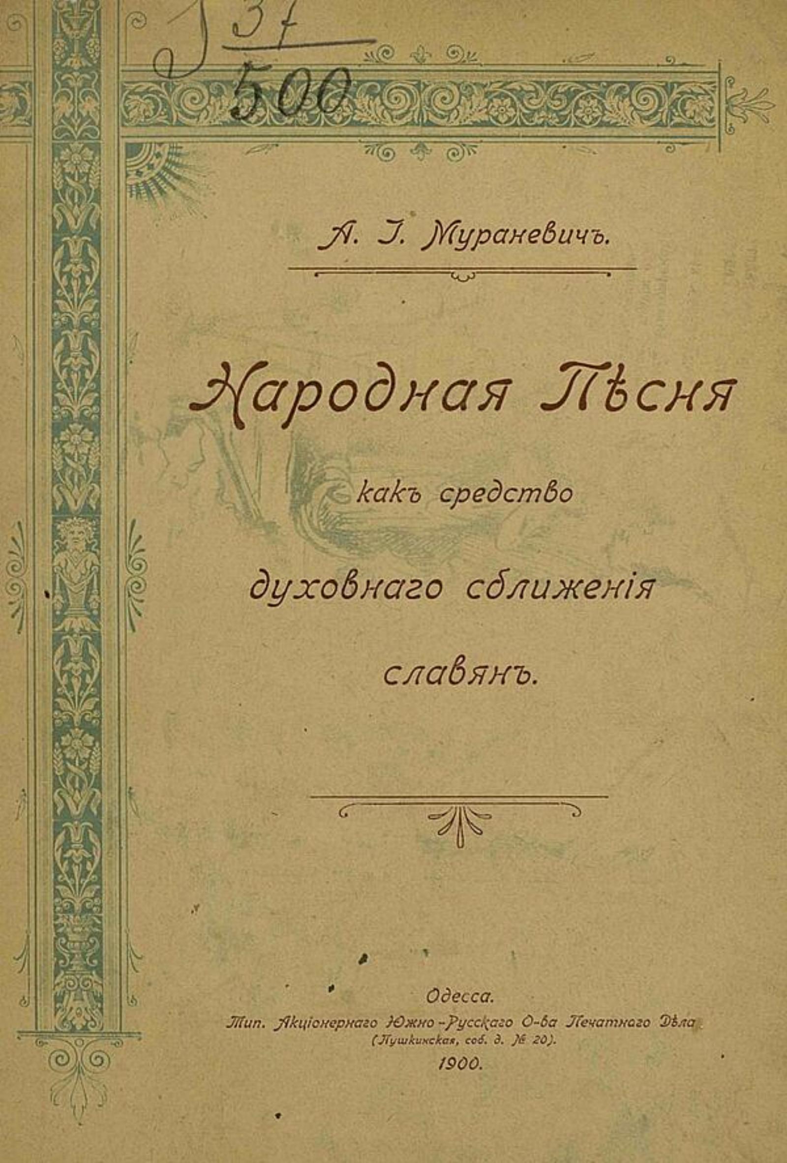 Мураневич, Александр Иович. Народная песня как средство духовного сближения славян / [Соч.] А. И. Мураневича. — Одесса : типография Акционерного Южно-русского о-ва печатного дела, 1900. — 46 с.; 23.