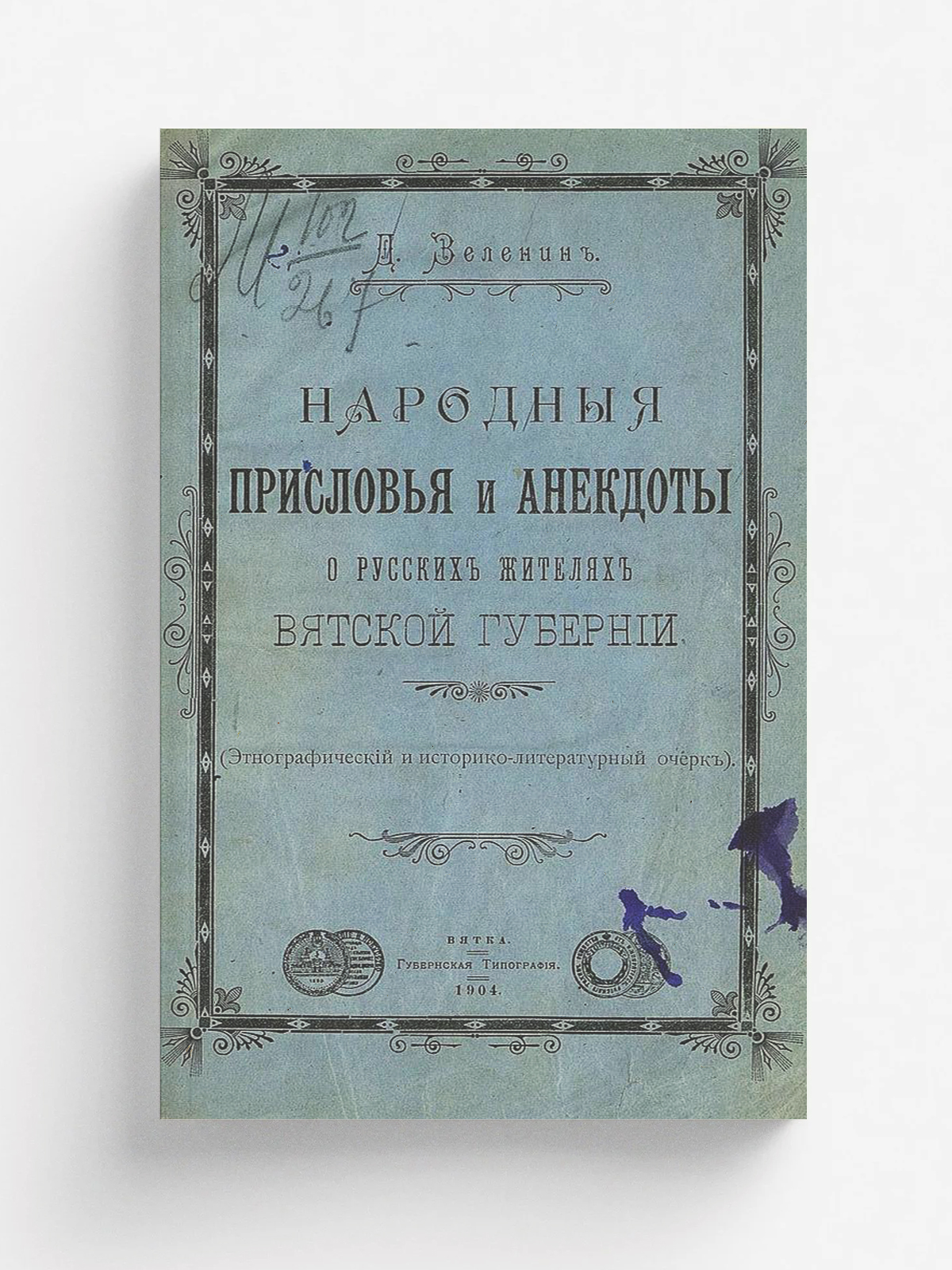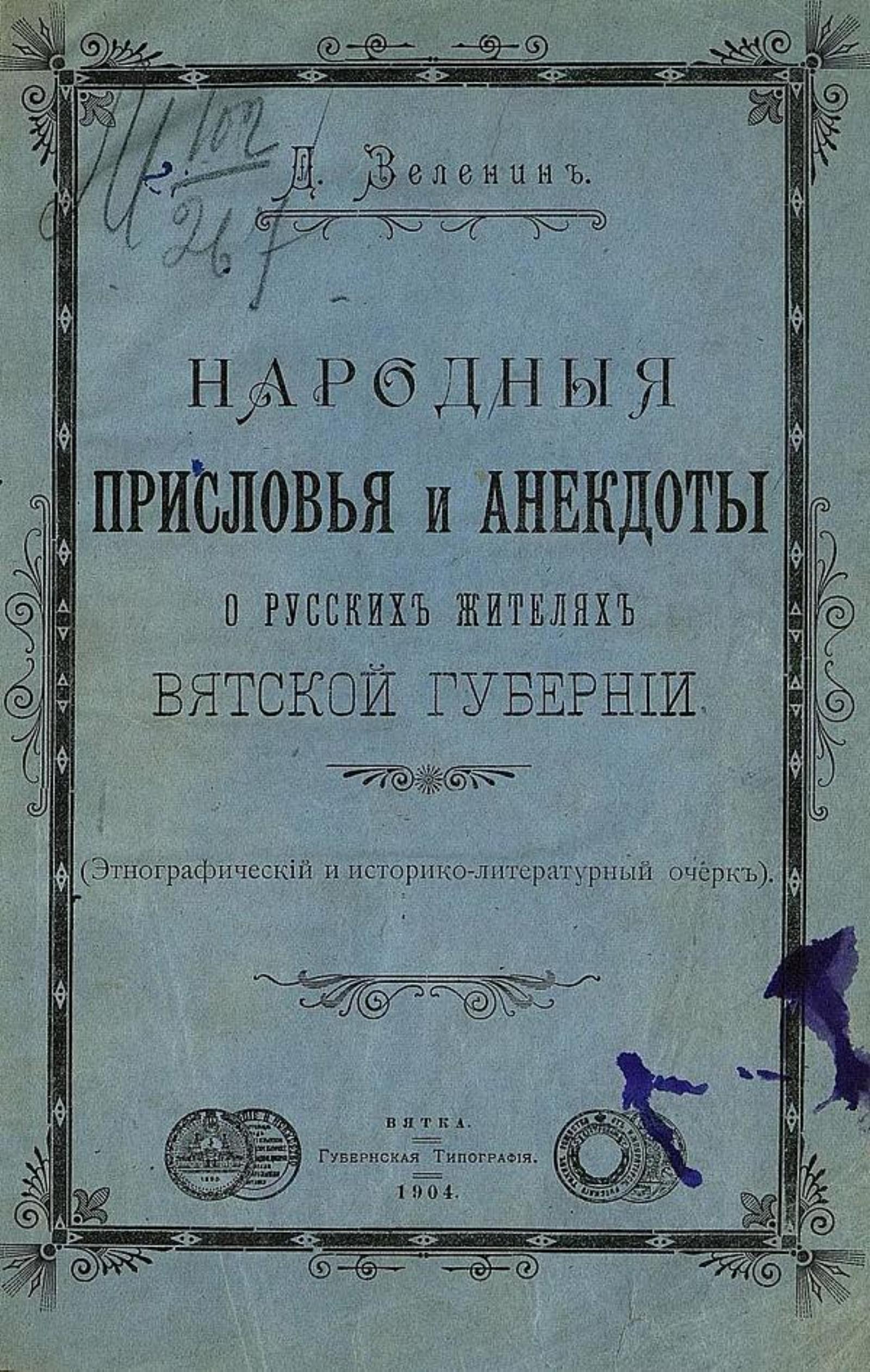 Зеленин, Дмитрий Константинович (1878–1954). Народные присловья и анекдоты о русских жителях Вятской губернии: (Этногр. и ист.-лит. очерк) / Д. Зеленин. — Вятка: Губ. тип., 1904. — [2], 54 с.; 22.