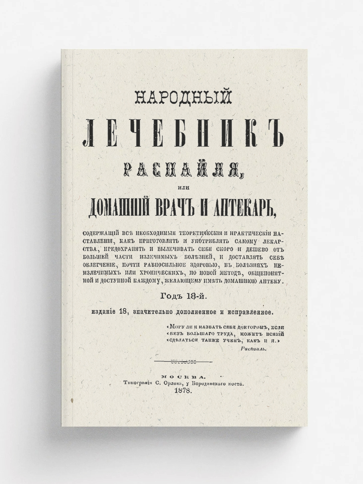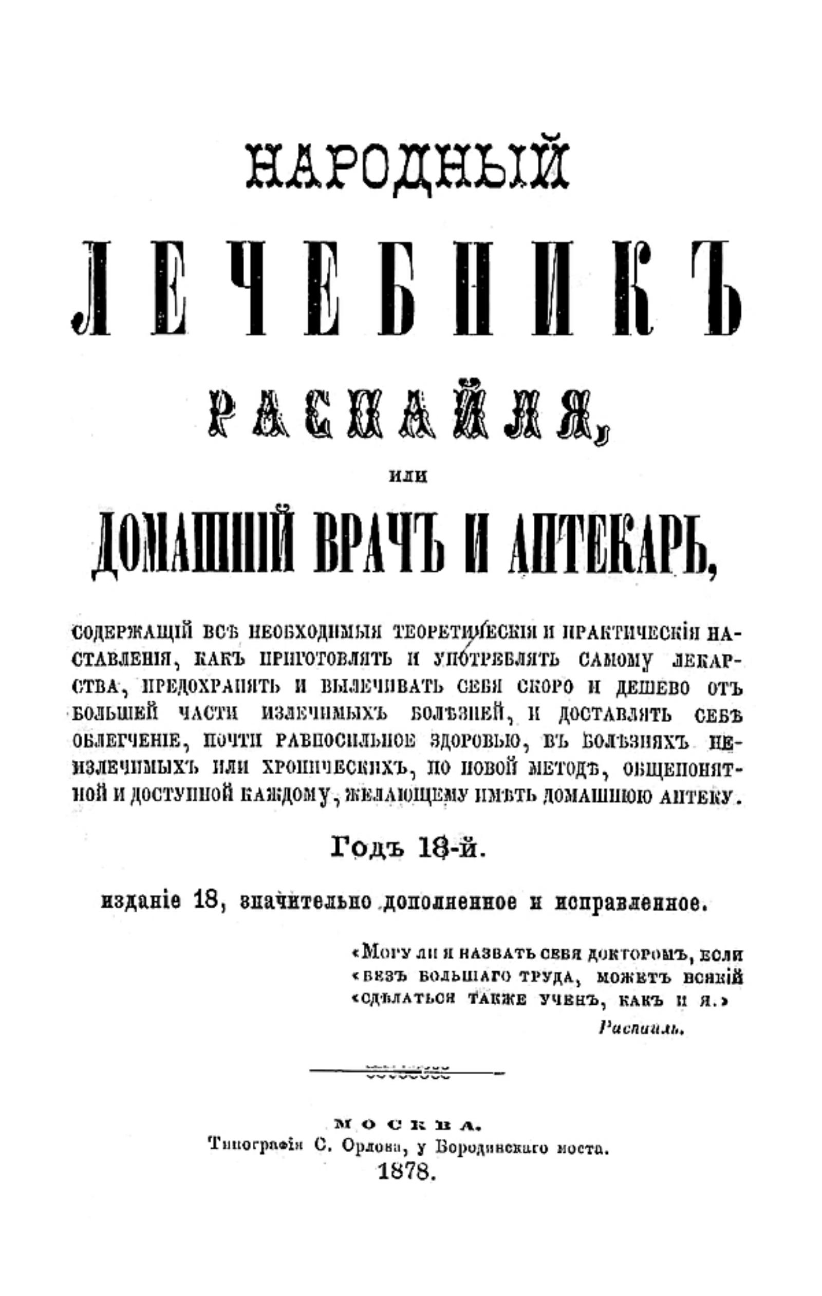 Распай, Франсуа Венсан (1794–1878). Народный лечебник Распайля, или Домашний врач и аптекарь, содержащий все необходимые теоретические и практические наставления, как приготовлять и употреблять самому лекарства, предохранять и вылечивать себя скороти дешево от большей части излечимых болезней... : Год 18-й. — 18-е изд., значит. доп. и испр. — Москва : тип. С. Орлова, 1878. — 294, XXVI с.; 21.
