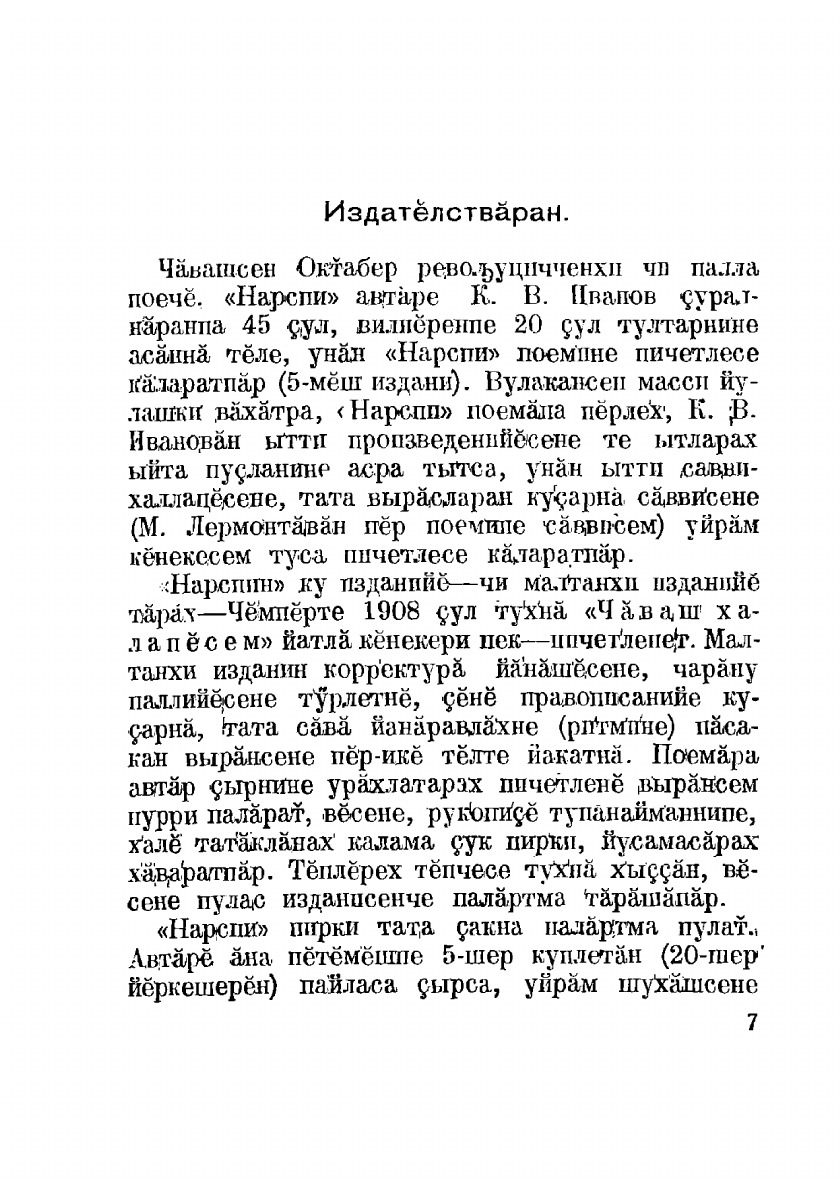 Эта книга — репринт оригинального издания (издательство "Чавашиздат", 1935 год), созданный на основе электронной копии высокого разрешения, которую очистили и обработали вручную, сохранив структуру и орфографию оригинального издания. Редкие, забытые и малоизвестные книги, изданные с петровских времен до наших дней, вновь доступны в виде печатных книг.