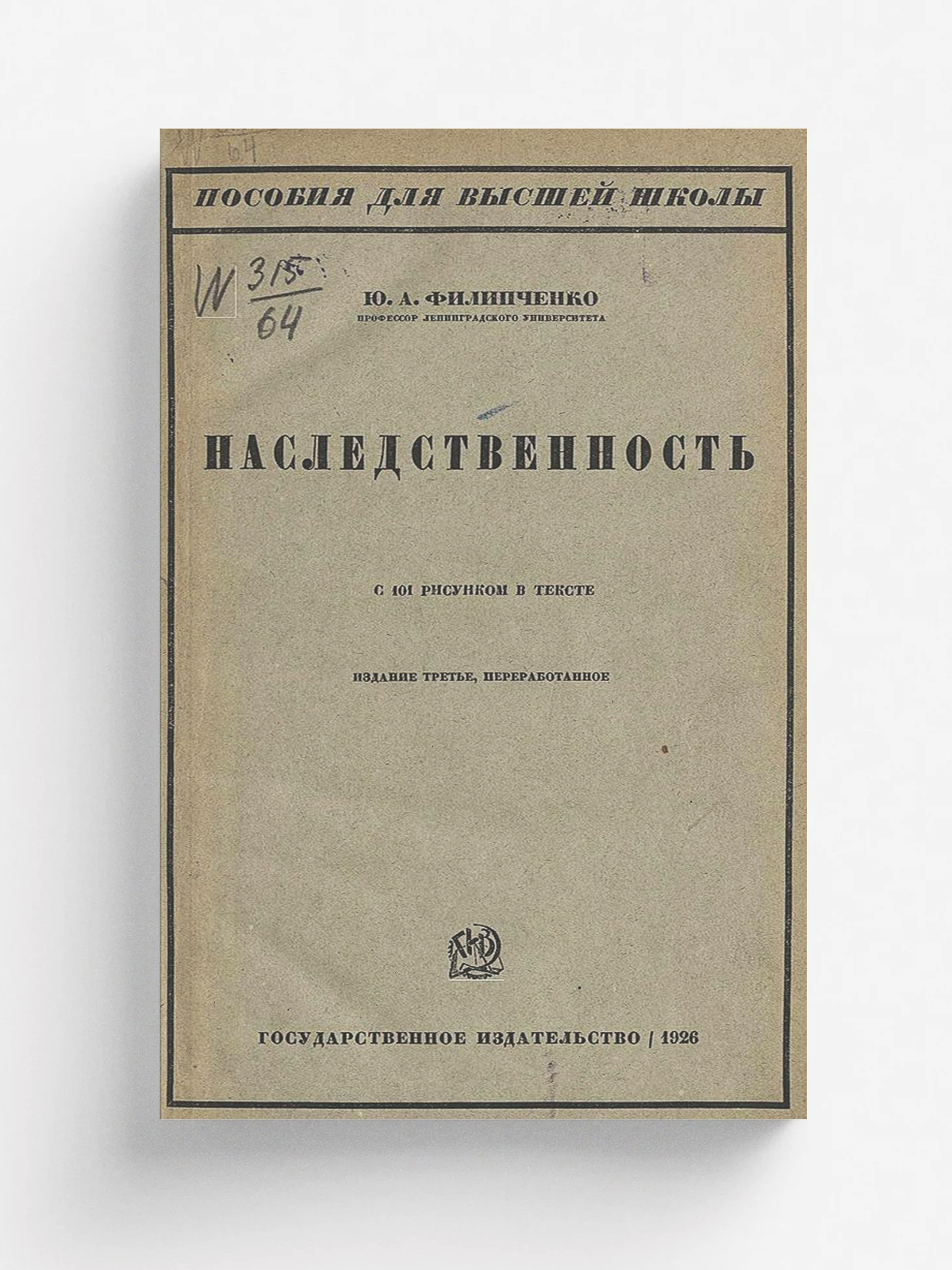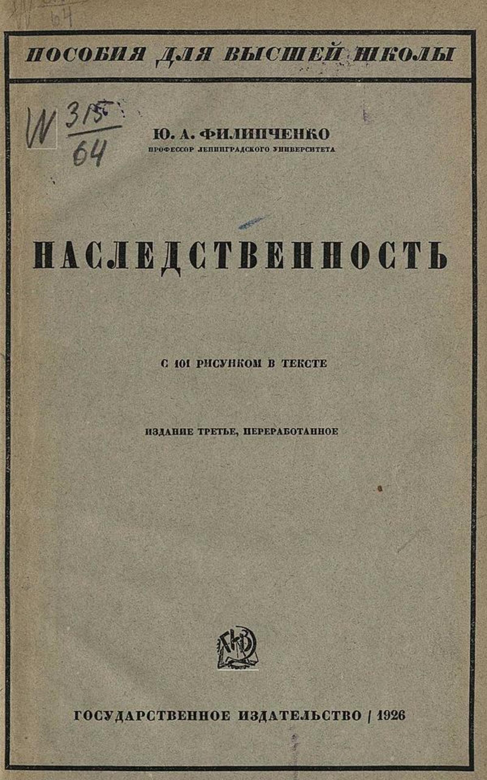 Филипченко, Юрий Александрович (1882–1930). Наследственность / Ю. А. Филипченко, проф. Ленингр. ун-та. — 3-е изд., перераб. — Москва ; Ленинград : Гос. изд-во, 1926. — 268 с., 101 ил.; 26 см. — (Пособия для высшей школы).