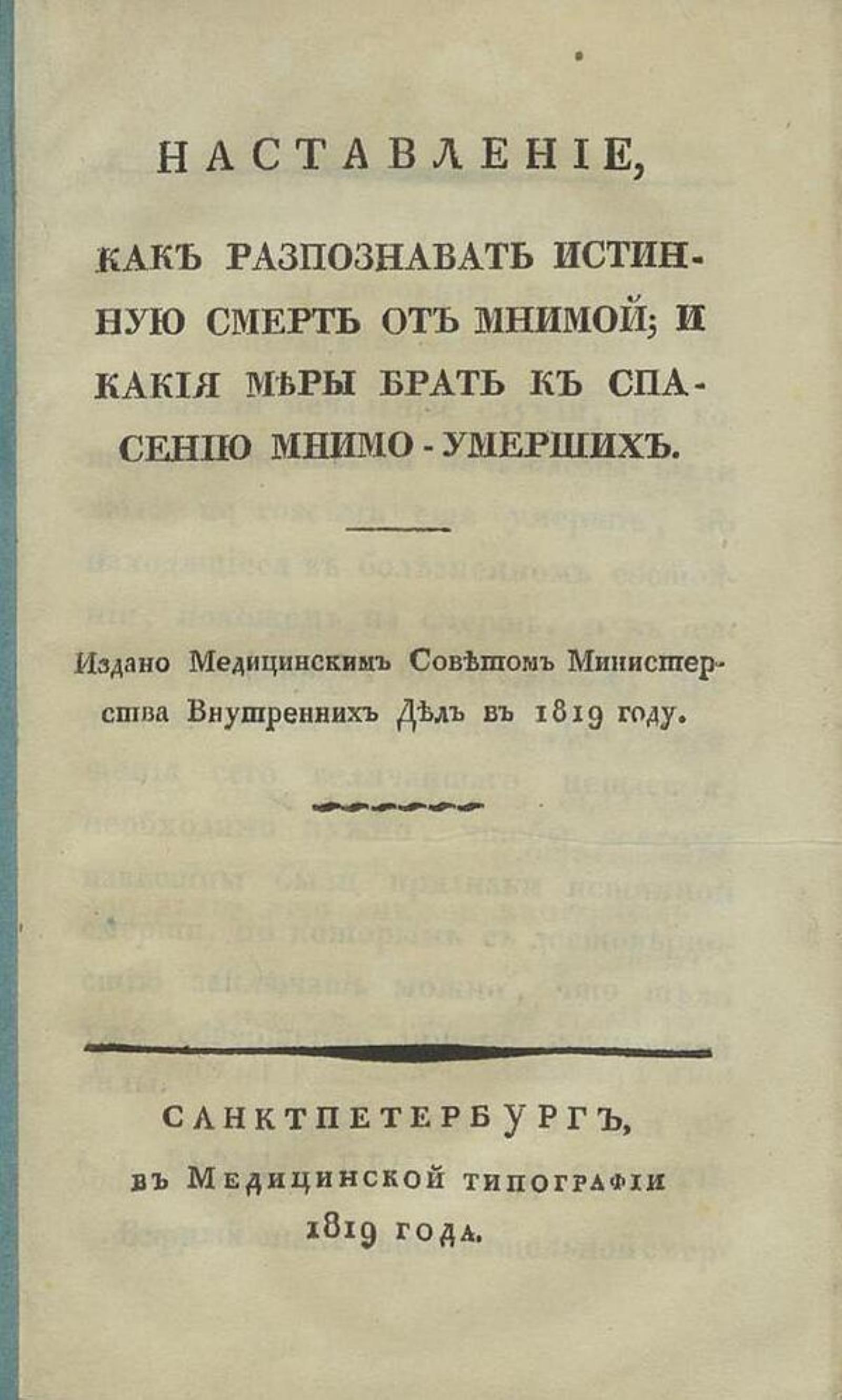 Наставление, как разпознавать истинную смерть от мнимой; и какия меры брать к спасению мнимо-умерших. / Издано Медицинским советом Министерства внутренних дел в 1819 году. — Санктпетербург : в Медицинской типографии, 1819. — 24 с.; 8°.