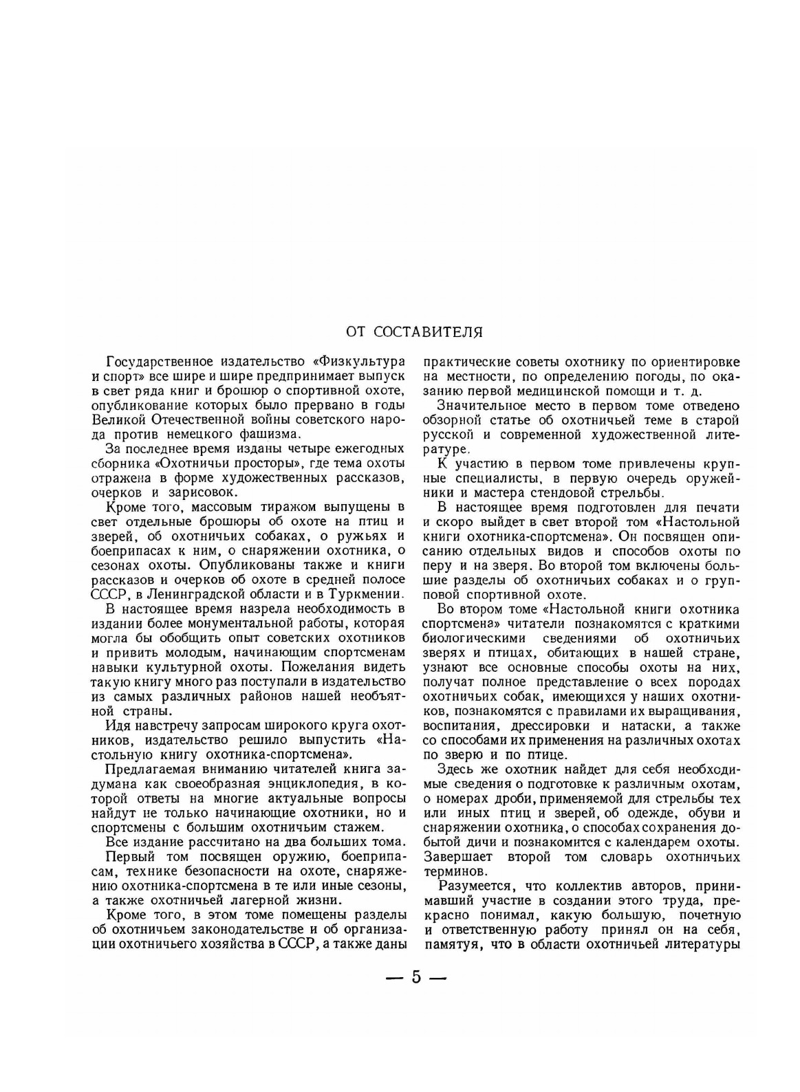 Первый том посвящен оружию, боеприпасам, технике безопасности на охоте, снаряжению охотника-спортсмена в те или иные сезоны, а также охотничьей лагерной жизни.