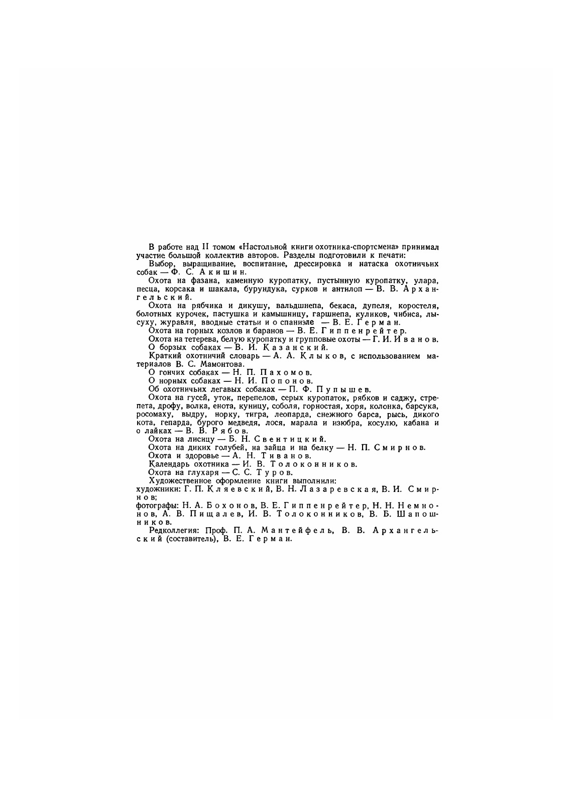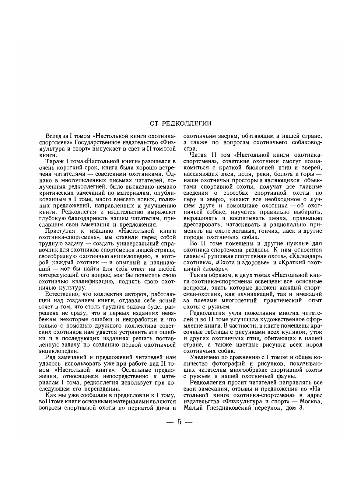 Тираж I тома «Настольной книги» разошелся в очень короткий срок, книга была хорошо встречена читателями — советскими охотниками. Однако в многочисленных письмах читателей, полученных редколлегией, было высказано немало критических замечаний по материалам, опубликованным в I томе, много внесено новых, полезных предложений, направленных к улучшению книги. Редколлегия и издательство выражают глубокую благодарность нашим читателям, приславшим свои замечания и предложения.