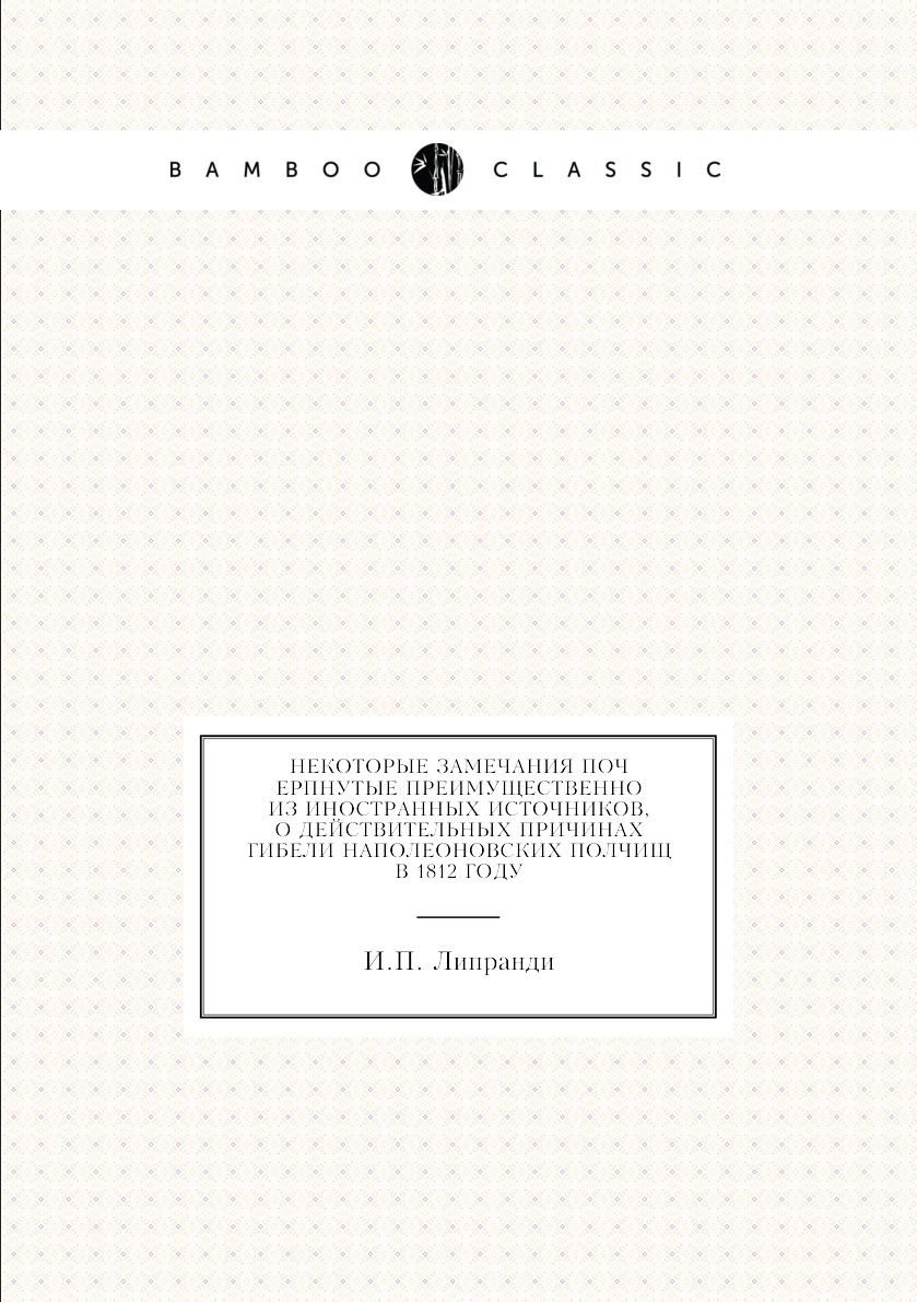 Печатная книга «Некоторые замечания почерпнутые преимущественно из иностранных источников, о действительных причинах гибели Наполеоновских полчищ в 1812 году» в мягкой обложке, язык - русский. В книге 226 страниц, она напечатана на белой офсетной бумаге плотностью 80 г/м². Формат издания — 148x210 мм. Все книги аккуратно упаковываем в прочный трёхслойный непрозрачный картонный конверт.