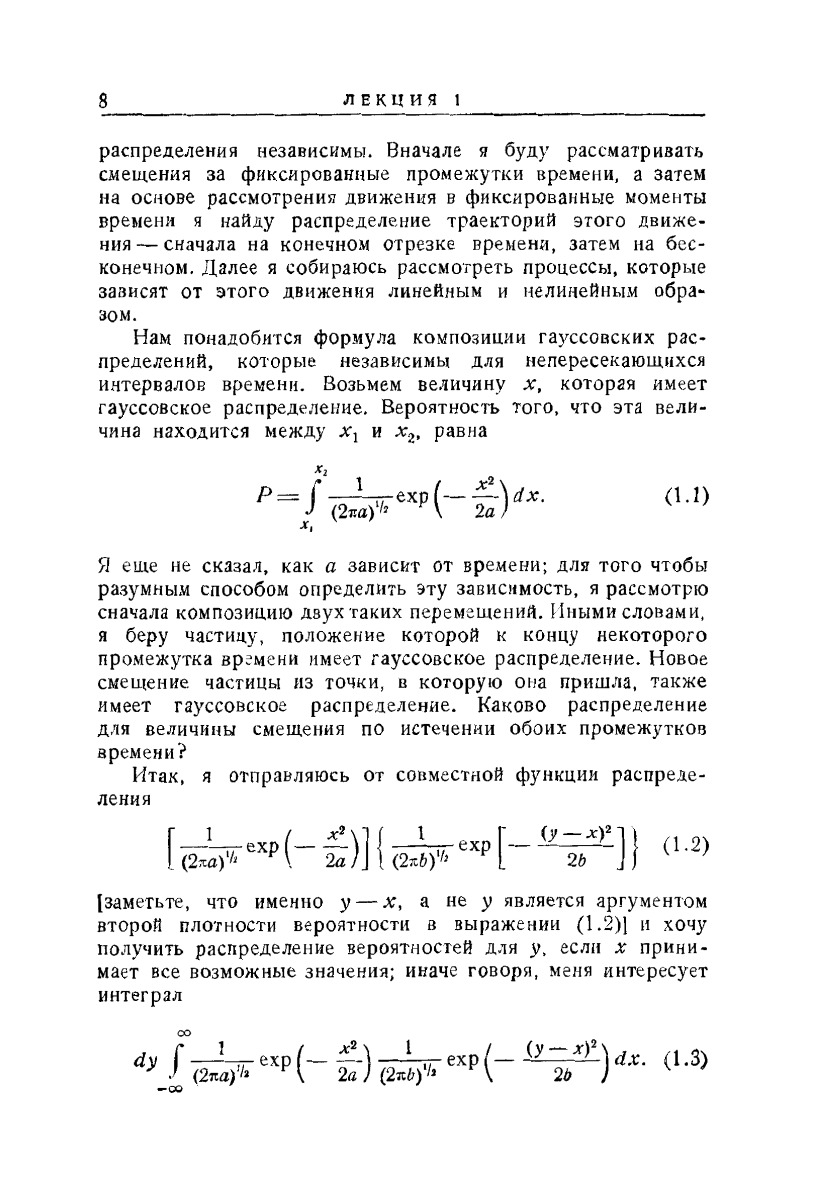 Книга представляет собой курс лекций известного математика Н. Винера, прочитанный им в 1958 году а Массачусетском технологическом институте. Рассмотрены понятия случайного процесса, меры в пространстве функций, функционала от случайного процесса. Большое внимание уделено случайному процессу типа «броуновского движения» и связанной с ним мере в пространстве непрерывных функций, введенной автором в 1923 г. И известной под названием меры Винера. Рассматриваются возможности применения изложенных методов к вопросам частотной модуляции, прохождения случайных сигналов через нелинейные системы, к задачам статистической механики и др. Книга будет полезна всем, кто занимается теорией случайных процессов и ее применениями в различных областях.