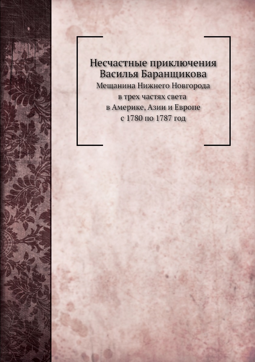 Печатная книга «Несчастные приключения Василья Баранщикова, Мещанина Нижнего Новгорода в трех частях света в Америке, Азии и Европе с 1780 по 1787 год» в мягкой обложке, язык - русский. В книге 140 страниц, она напечатана на белой офсетной бумаге плотностью 80 г/м². Формат издания — 148x210 мм. Все книги аккуратно упаковываем в прочный трёхслойный непрозрачный картонный конверт.