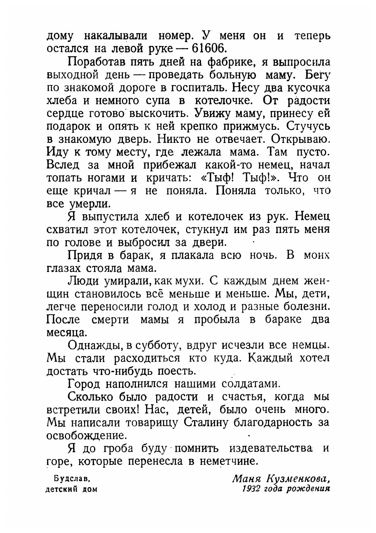 Никогда не забудем! Сборник рассказов белорусских детей о днях Великой Отечественной войны / [Рассказы собраны и записаны под рук. Я. Мавра] ; [Пер. с белорус. П. Кобзаревского] ; [Обработка для детей Л. Раковского] ; Рис. В. Петровой. — Москва ; Ленинград : изд-во и 2-я ф-ка дет. книги Детгиза, 1949 (Ленинград). — 120 с., 10 л. ил. : ил.; 20 см.