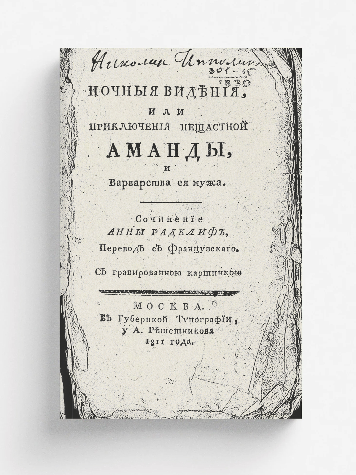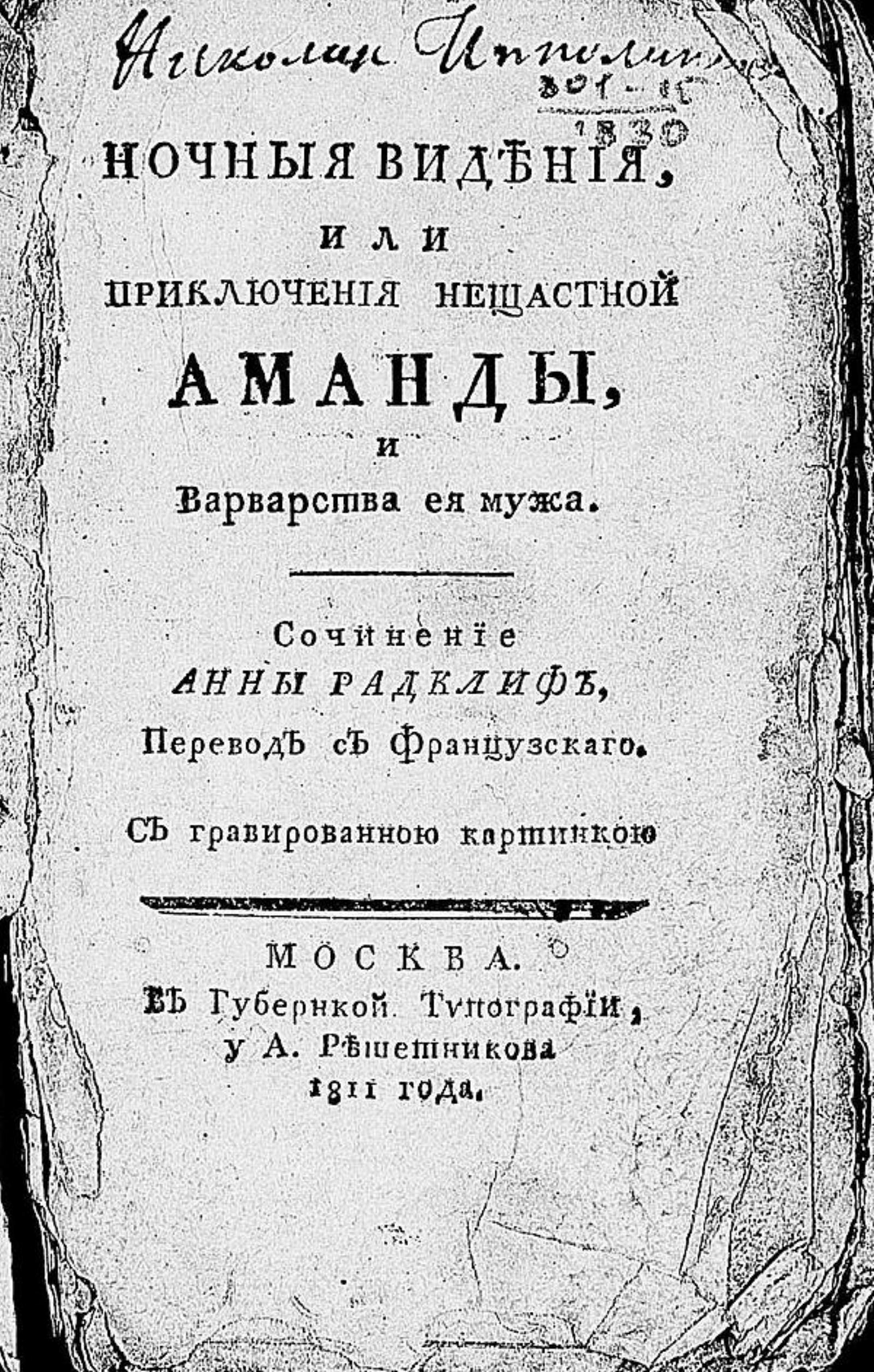 Ночные видения, или Приключения несчастной Аманды, и варварства ее мужа / Сочинение Анны Радклиф; Перевод с французскаго. С гравированною картинкою. — Москва : В Губернской типографии, у А. Решетникова, 1811. — 167, [1] с., [1] л. ил.; 18° (15 см).