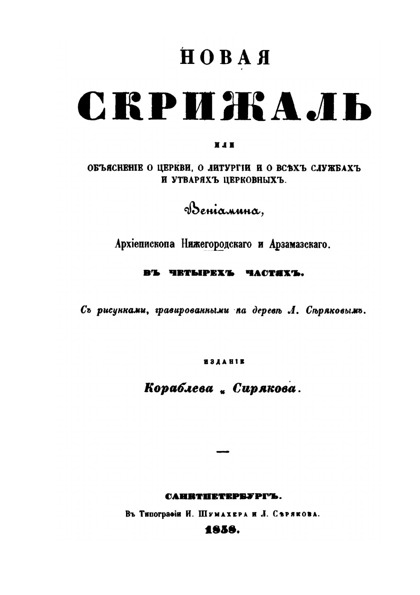 Новая скрижаль Вениамина, архиепископа Нижегородского и Арзамасского. В четырех частях. С 77-ю рисунками в тексте. Издание Кораблева и Сирякова.