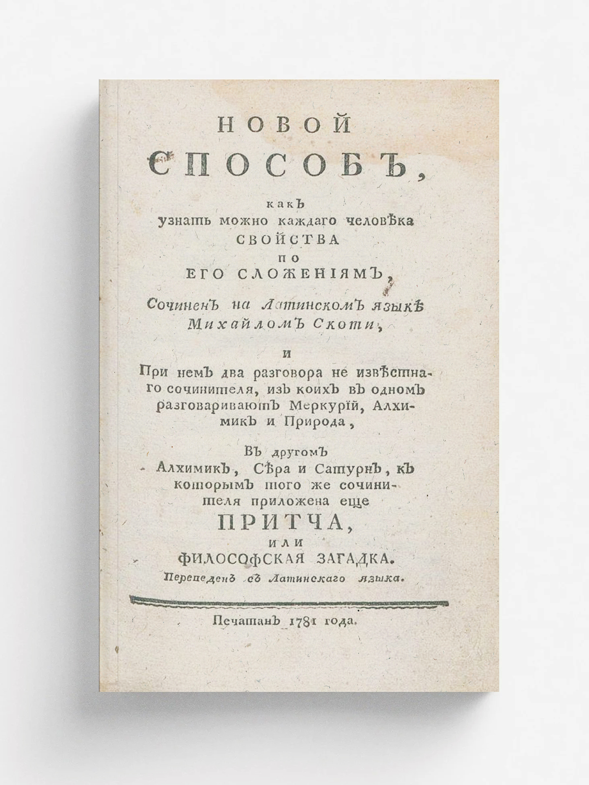 Скот, Майкл. Новой способ, как узнать можно каждаго человека свойства по его сложениям, / Сочинен на латинском языке Михайлом Скоти, ; И при нем два разговора не известнаго сочинителя, из коих в одном разговаривают Меркурий, Алхимик и Природа, в другом Алхимик, Сера и Сатурн ; К которым того же сочинителя приложена еще Притча, или Философская загадка ; Переведен с латинскаго языка. — [Москва] : [Сенат. тип.], 1781. — 159 с.; 8°.