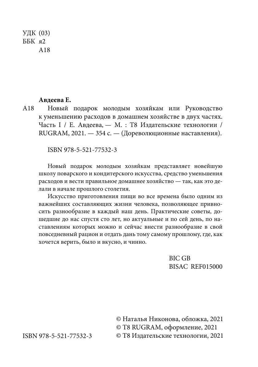 Печатная книга «Новый подарок молодым хозяйкам или Руководство к уменьшению расходов в домашнем хозяйстве в двух частях, Часть I» в мягкой обложке, язык - русский. В книге 354 страниц, она напечатана на белой офсетной бумаге плотностью 80 г/м². Формат издания — 148x210 мм. Все книги аккуратно упаковываем в прочный трёхслойный непрозрачный картонный конверт.