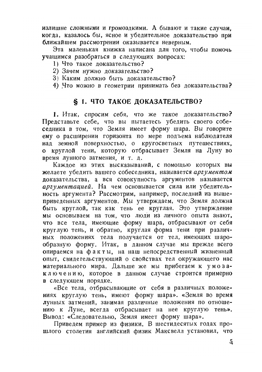 Однажды, в самом начале учебного года, мне пришлось услышать разговор двух девочек. Старшая из них перешла в шестой класс, младшая — в пятый. Девочки делились своими впечатлениями об уроках, учителях, подругах, о новых предметах. Шестиклассницу очень удивили уроки геометрии: «Вот чудеса, — говорила она, — пришла учительница в класс, нарисовала на доске два равных треугольника, а потом целый урок доказывала нам, что они— равные. Никак не пойму: зачем это нужно?». — «А как же ты урок будешь отвечать?»— спросила младшая девочка. —«Выучу по учебнику... вот только очень трудно запомнить, где какую букву нужно ставить.,.».В тот же день вечером я слышал, как эта девочка, сидя у окна, усердно учила геометрию: «Для доказательства наложим треугольник А'В'С' на треугольник АВС... наложим треугольник А'В'С' на треугольник ABC..» — неоднократно повторяла она. К сожалению, мне не удалось узнать, насколько успешно училась эта девочка по геометрии, но думается, что учиться ей по этому предмету было довольно трудно.Несколько дней спустя пришел ко мне мой сосед по квартире Толя, тоже шестиклассник» и также с претензиями к геометрии. Им рассказали на уроке и задали на дом выучить теорему о том, что в треугольнике внешний угол больше всякого внутреннего, не смежного с ним. Толя показал мне чертеж из учебника Киселева (черт. 1) и спросил: «Зачем нужно приводить длинное и сложное доказательство, когда на этом чертеже совершенно ясно видно, что внешний угол треугольника — тупой, а не смежные с ним внутренние углы — острые? Но ведь тупой угол всегда больше острого,—убеждал меня Толя,—это же ясно без всякого доказательства». И мне пришлось разъяснить Толе, что предложение это совсем не очевидно и что если полное основание требовать доказательства предложения о внешнем угле треугольника.