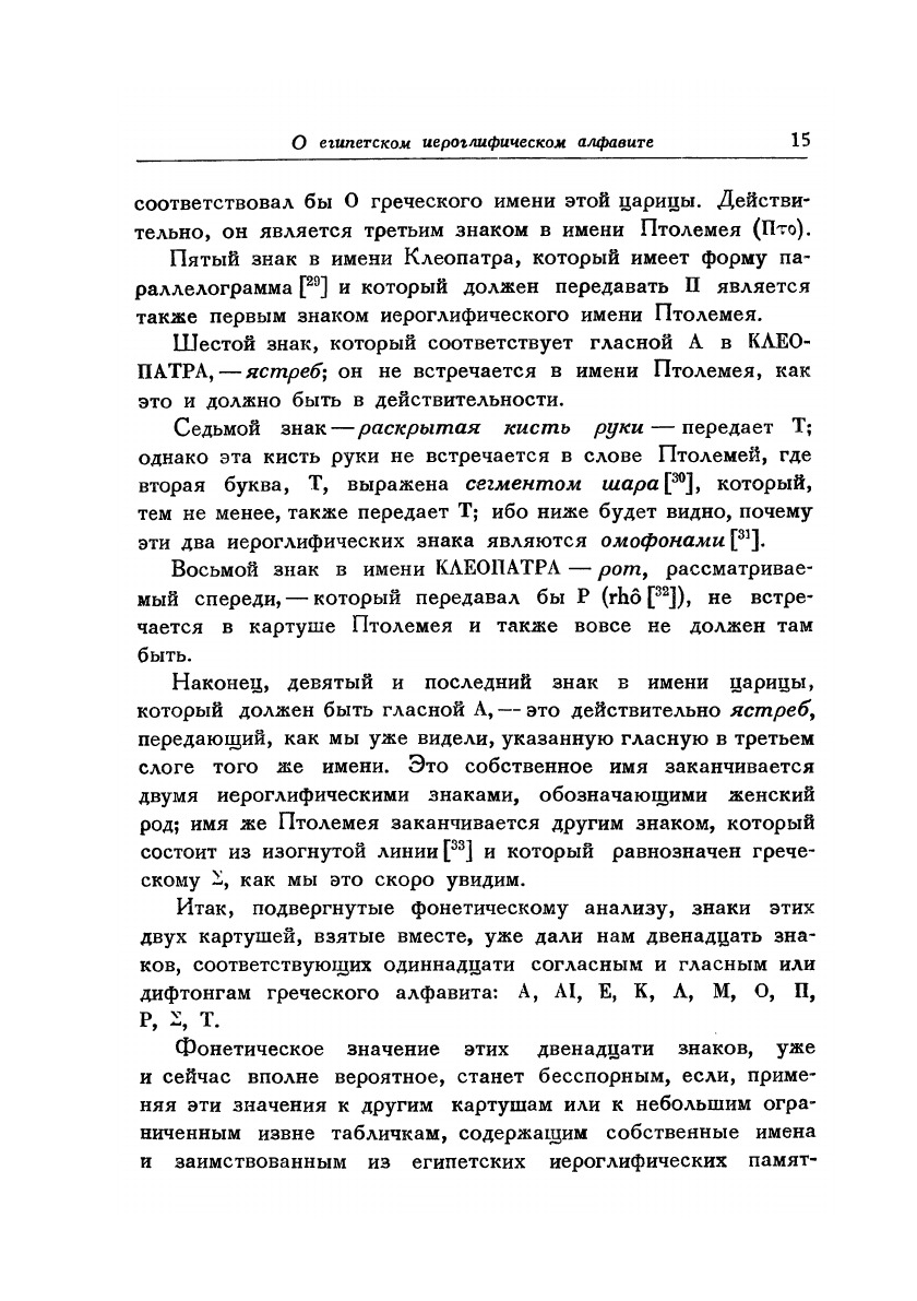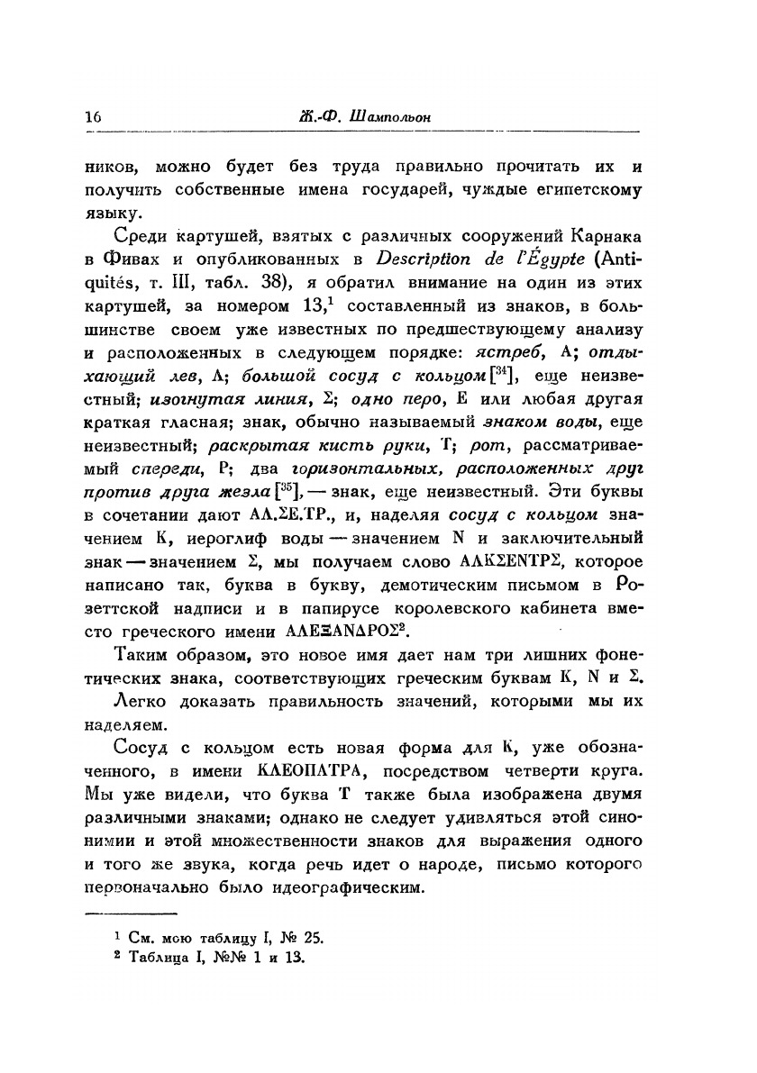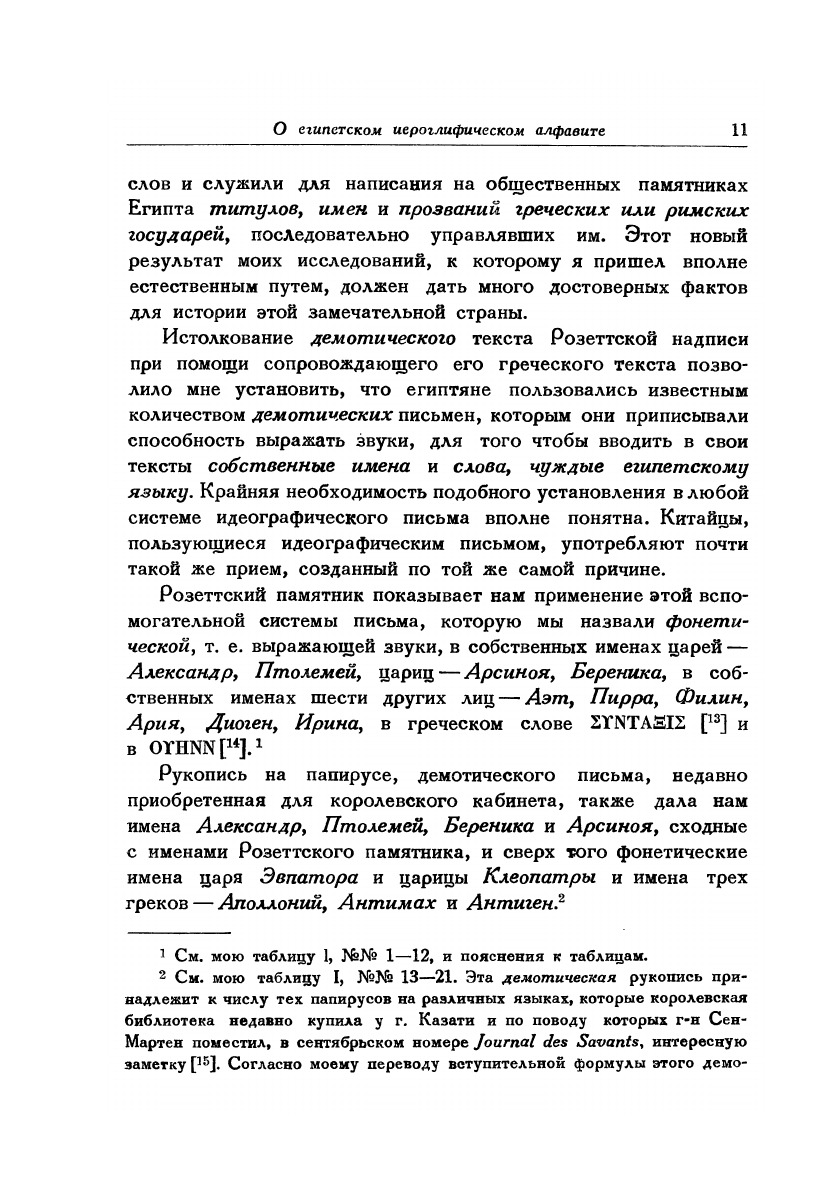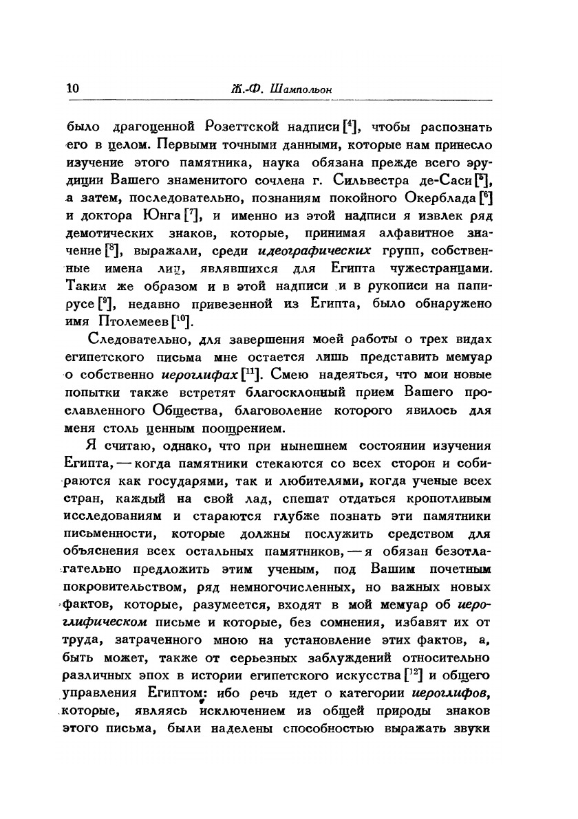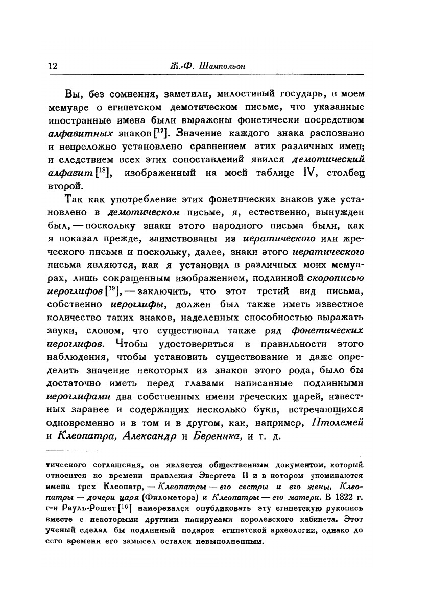 В книгу вошел известнейший труд в котором Шампольон впервые произвел расшифровку иерголифического египетского письма. Содержание: Шампольон Ж.-Ф.:О египетском иероглифическом алфавите (Письмо к г. Дасье, непременному секретарю королевской Академии надписей и изящной словесности относительно алфавита фонетических иероглифов, применявшихся египтянами для написания на их памятниках титулов, имен и прозваний греческих и римских государей.