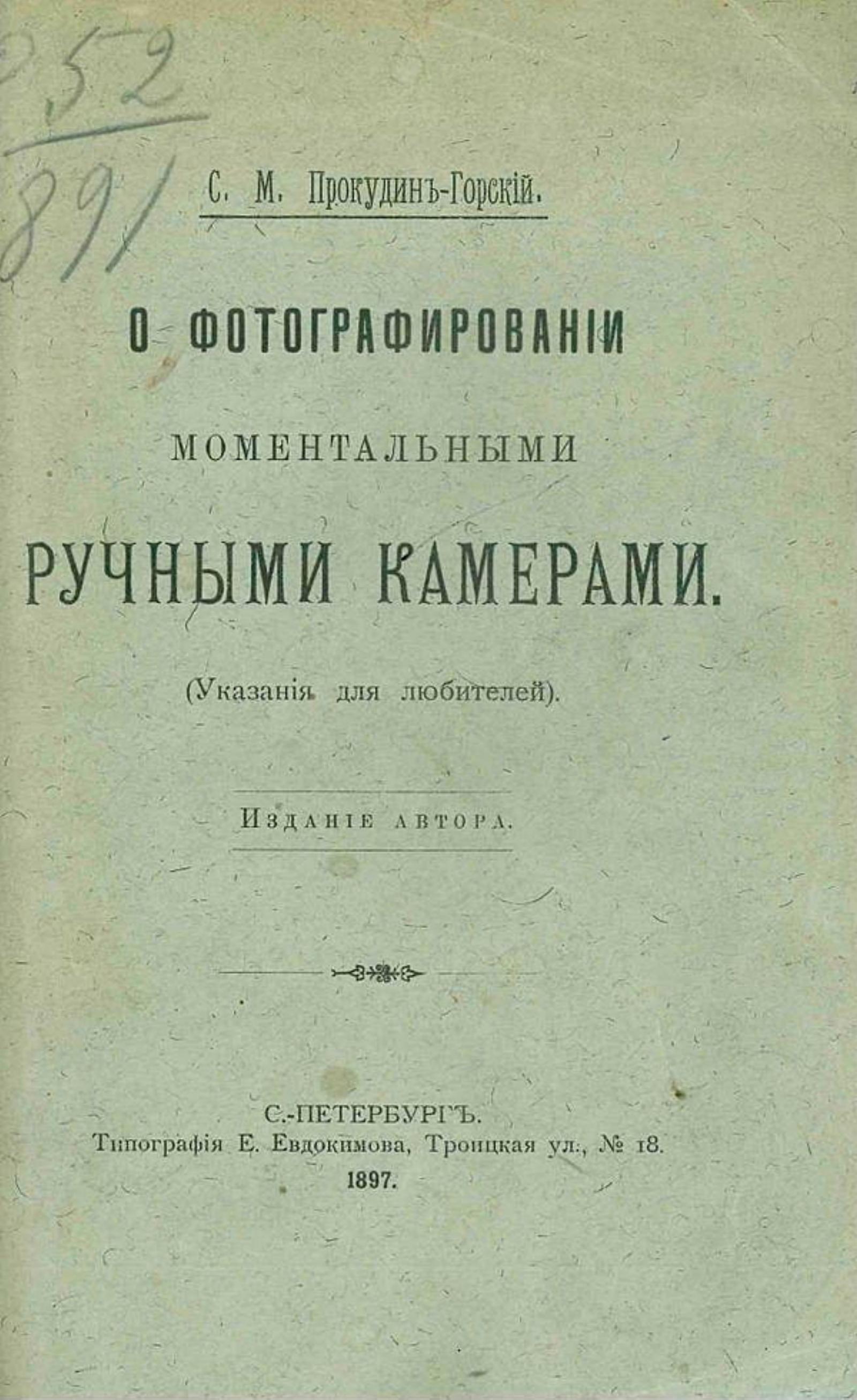 Прокудин-Горский, Сергей Михайлович (1863–1944). О фотографировании моментальными ручными камерами : (Указания для любителей) / С. М. Прокудин-Горский. — Санкт-Петербург : изд. авт., 1897. — 32 с.; 20.