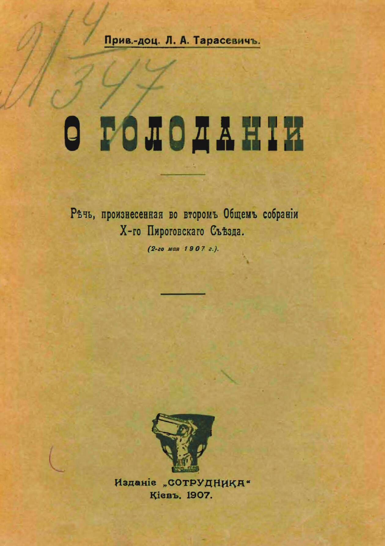 Тарасевич, Лев Александрович (1868–1927). О голодании : Речь, произнес. во втором общ. собр. 10 Пирогов. съезда (2 мая 1907 г.) / Прив.-доц. Л.А. Тарасевич. — Киев : Сотрудник, 1907. — 32 с.; 25.
