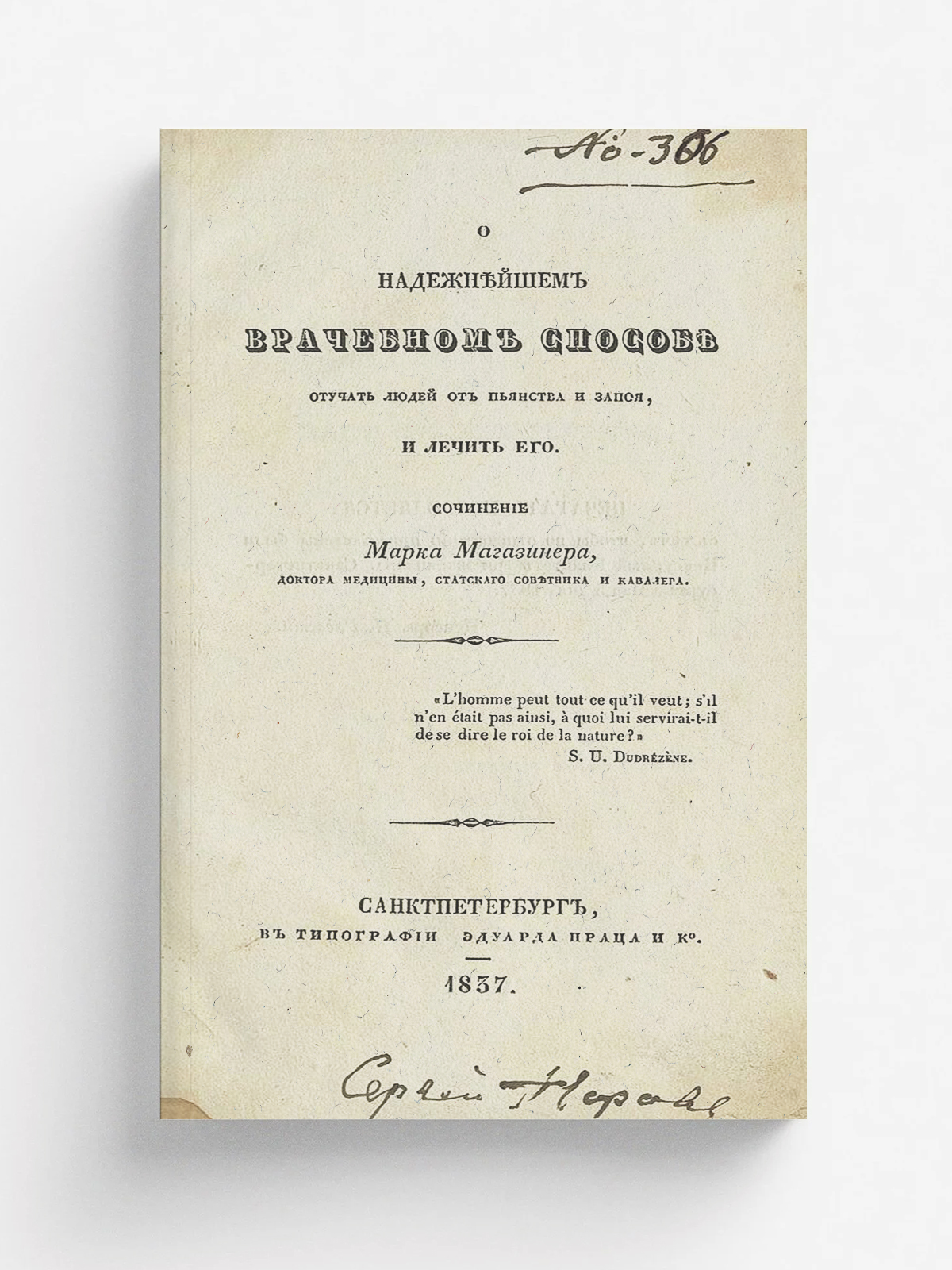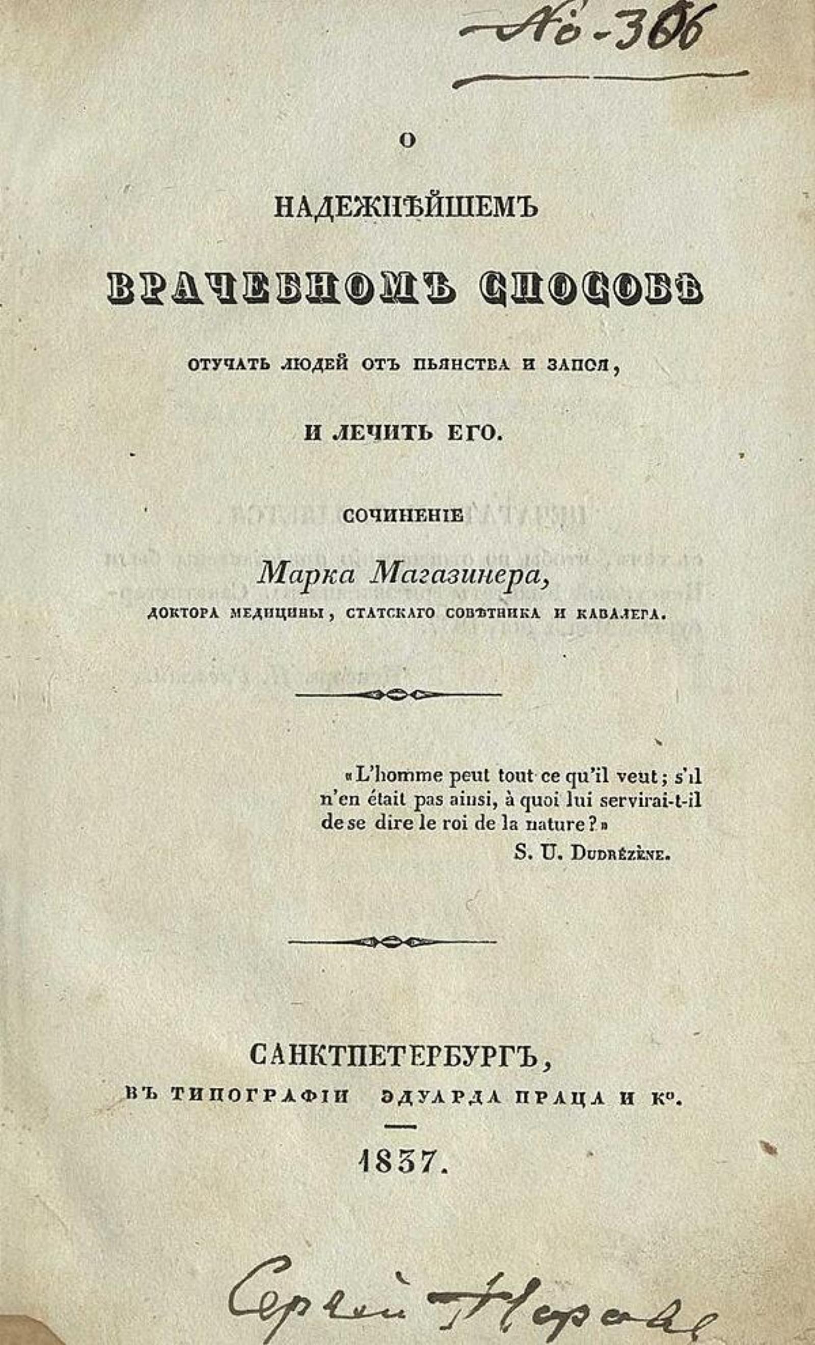 Магазинер, Марк Яковлевич. О надежнейшем врачебном способе отучать людей от пьянства и запоя, и лечить его / Надежнейший способ отучать людей от пьянства и запоя / Соч. М. Я. Магазинера, д-ра мед.... — Санкт-Петербург : тип. Э. Праца и К°, 1837. — 80 с.; 23.