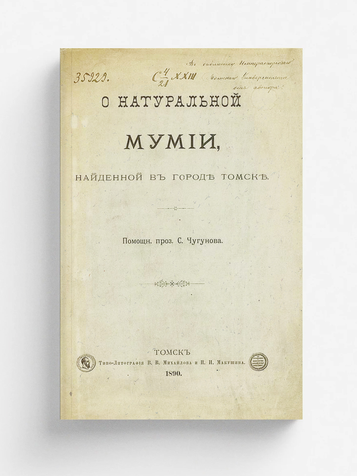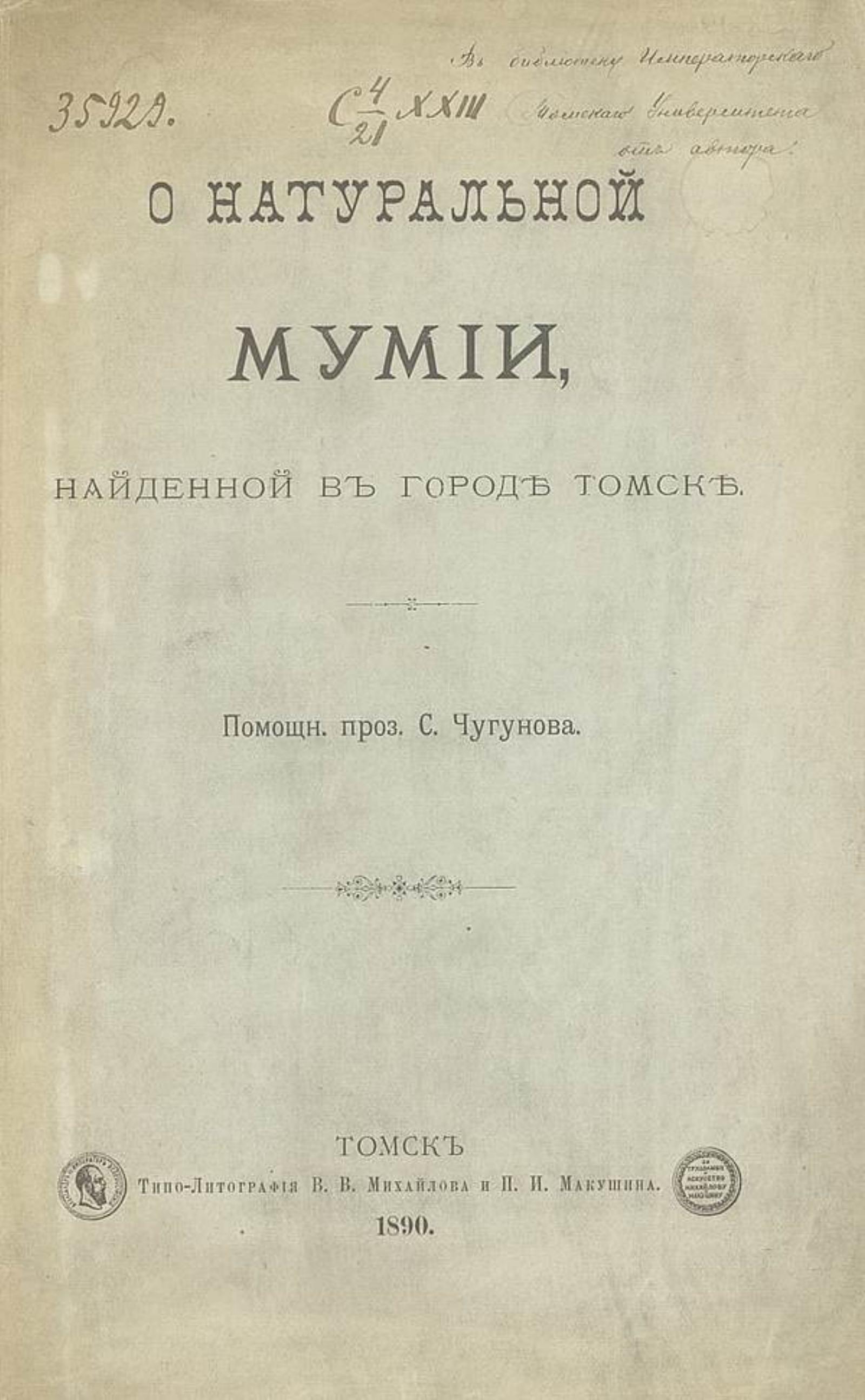 Чугунов С. М. О натуральной мумии, найденной в городе Томске / С. Чугунов. Типо-Лптография В. В. Михайлова и П. И. Макушина. — Томск, 1890.