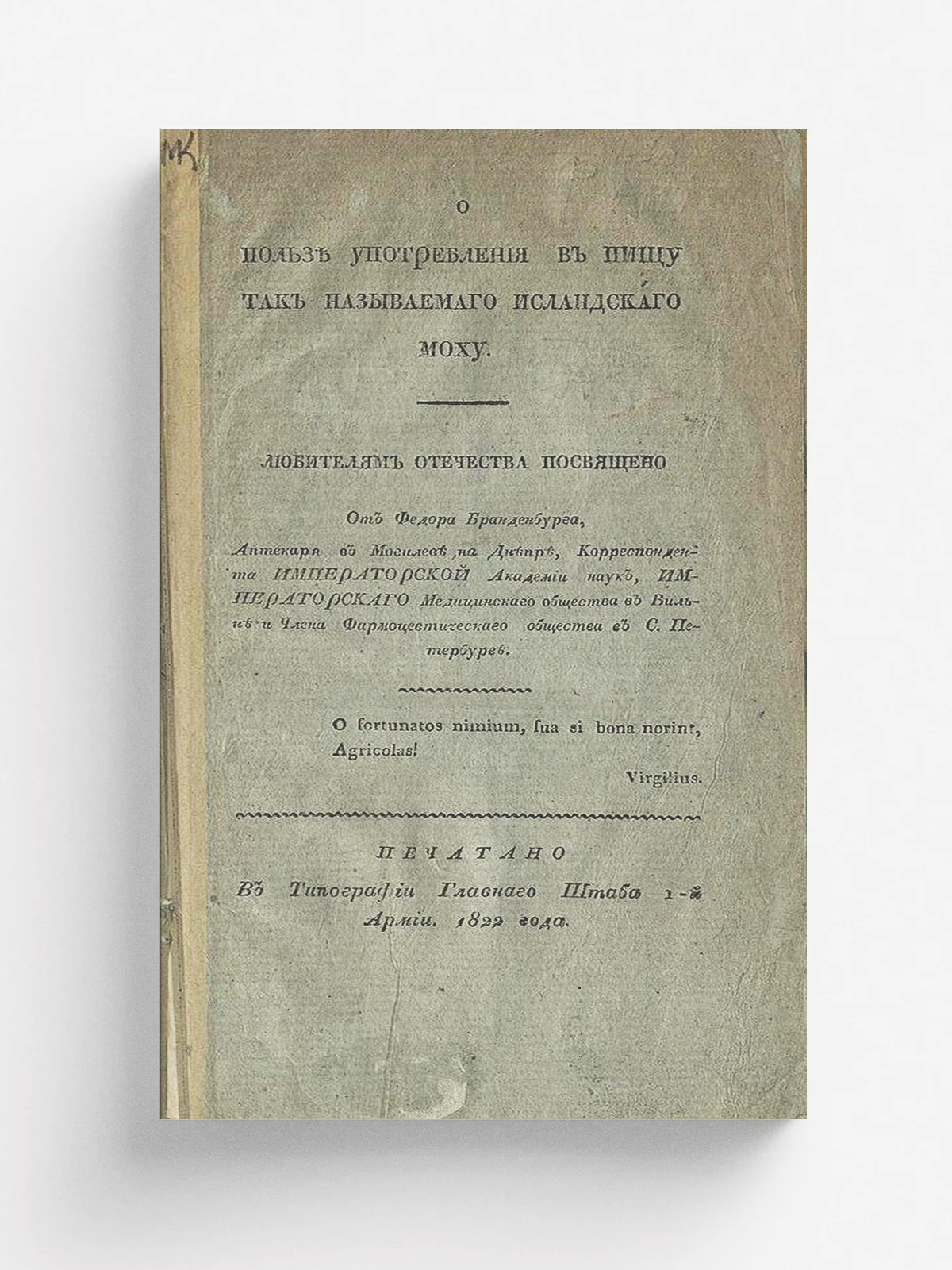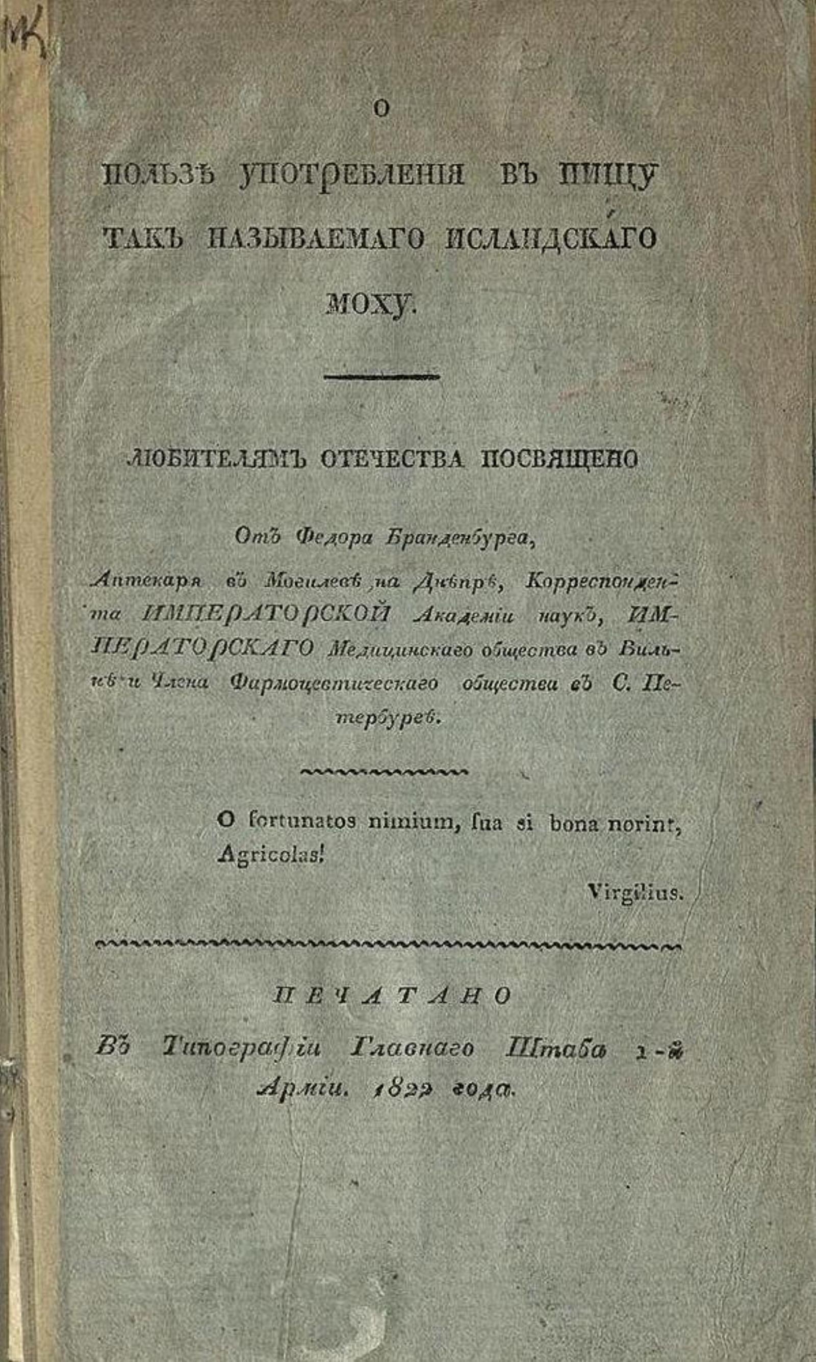 Бранденбург, Федор (1781–1837). О пользе употребления в пищу так называемаго исландскаго моху. / Любителям Отечества посвящено от Федора Бранденбурга, аптекаря в Могилеве на Днепре, корреспондента Императорской Академии наук, Императорскаго Медицинскаго общества в Вильне и члена Фармацевтическаго общества в С.-Петербурге. — [Спб.] : Печатано в типографии Главнаго штаба 1-й армии, 1822. — 18 с.; 8° (20 см).