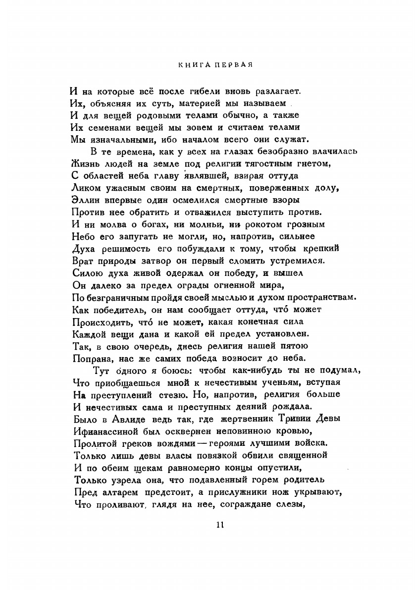 Новое русское издание бессмертной поэмы Лукреция «О природе вещей» приурочено к редкому юбилею: 2000 лет со дня смерти Тита Лукреция Кара. По единственному сохранившемуся, хотя и не вполне достоверному свидетельству, Лукреций умер в 55 г. до н. э., т. е. 2000 лет тому назад, в возрасте 44 лет. Несмотря на непривычную отдаленность этого срока, особенно в истории науки, поэма Лукреция для современного читателя — специалиста-литературоведа, естествоиспытателя, философа и просто интеллигента — кажется в большинстве своих частей удивительно свежей и интересной, в отличие от многого другого, что нам оставила древность. Тайна этой необыкновенной жизненности дидактического произведения Лукреция кроется, конечно, прежде всего в глубоком родстве атомистических догадок античных атомистов, излагаемых в поэме, с современной наукой, в близости материалистической философии Эпикура — Лукреция к современному научному воззрению и, наконец, в высоких поэтических качествах поэмы. Изучение и издание поэмы Лукреция с давних пор монополизировано филологами по основаниям достаточным и очевидным. Однако несомненно, что поэма «О природе вещей» — не только великий литературный памятник, но одновременно важнейшее сочинение в истории естествознания, содержащее наиболее полное и мотивированное изложение одного из вариантов античного атомизма. Поэтому включение нашего издания поэмы Лукреция в серию «Классики науки» едва ли требует особых разъяснений.