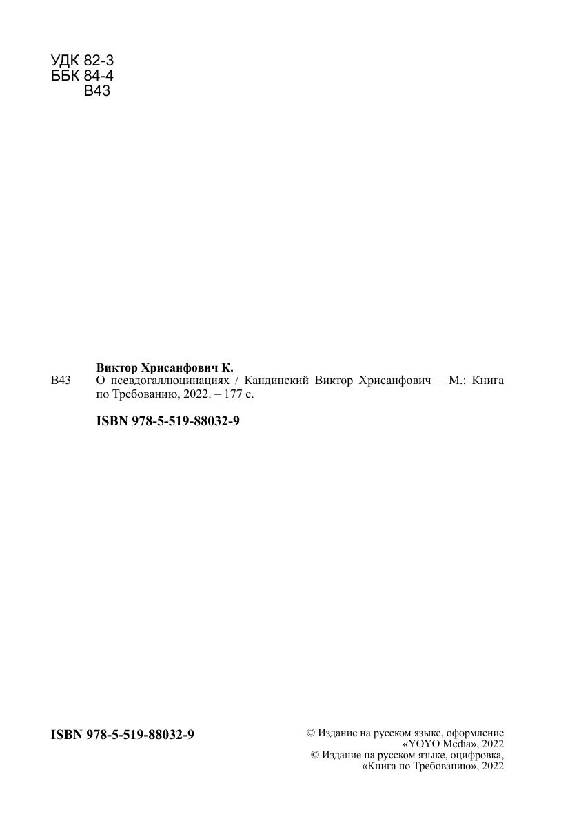 Печатная книга «О псевдогаллюцинациях» в мягкой обложке, язык - русский. В книге 177 страниц, она напечатана на белой офсетной бумаге плотностью 80 г/м². Формат издания — 148x210 мм. Все книги аккуратно упаковываем в прочный трёхслойный непрозрачный картонный конверт.