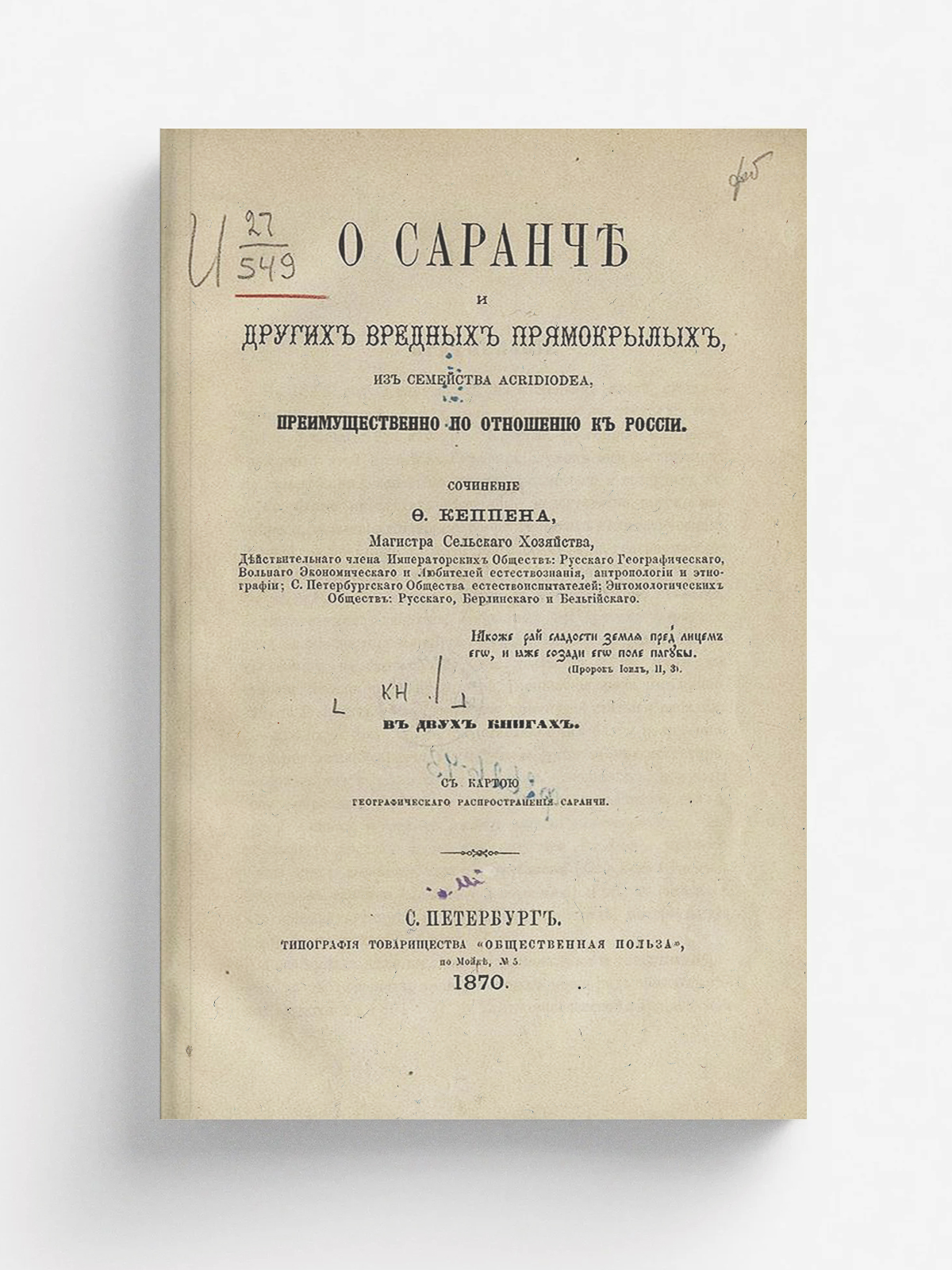 Кеппен, Федор Петрович (1833–1908). О саранче и других вредных прямокрылых из семейства Acridiodea, преимущественно по отношению к России : В 2 кн. : С карт. геогр. распространения саранчи. [Кн. 1] / Соч. Ф. Кеппена, магистра сел. хоз., д. чл. Имп. о-в: Рус. геогр., Вольн. экон. [и др.]. — Санкт-Петербург : тип. т-ва «Обществ. польза», 1870. — 24. О перелетной саранче (Pachytylus migratorius L.)]. — 1870. — [8], 352 с., 1 л. карт.