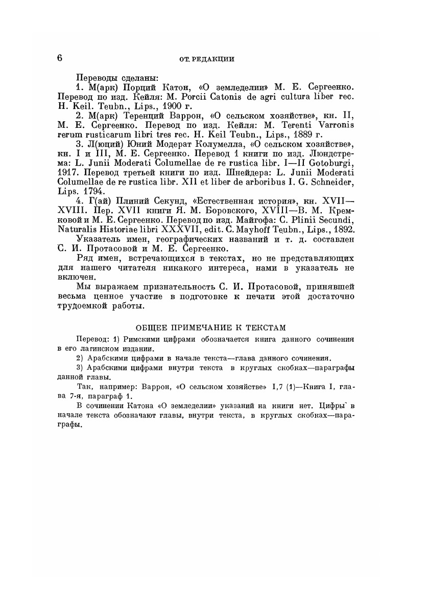 В настоящем издании, имеющем целью общее ознакомление читателя с характером и содержанием работ римских агрономических писателей, печатаются отдельные части, главы и книги из античных сочинений, посвященных сельскому хозяйству. При отборе материала для настоящего сборника мы стремились дать представление читателю об общем характере данного источника, поэтому вместо набора "избранных" отрывков мы предпочитали печатать книги или главы целиком, не сокращая произвольно тех мест, которые могут показаться тому или другому читателю мало интересными. Так, например, печатаются отдельные главы из Катона не только земледельческого, но и "домоводческого" характера.