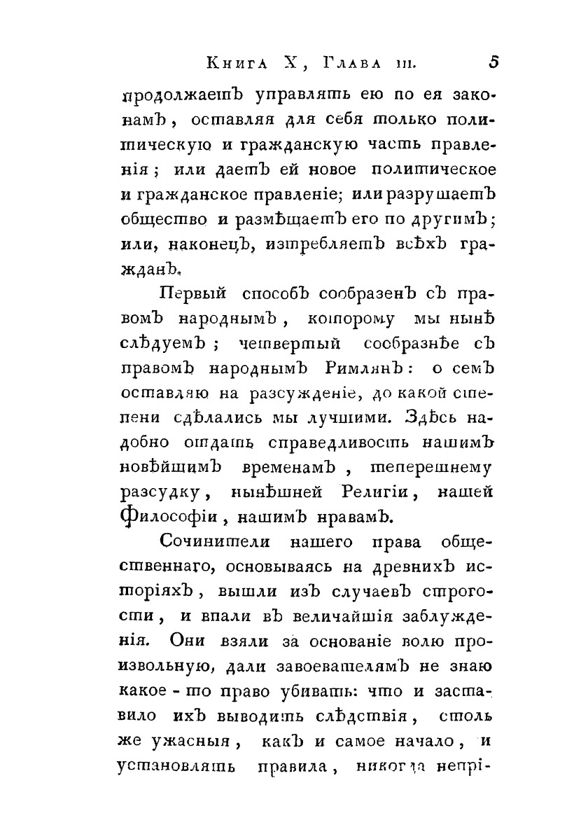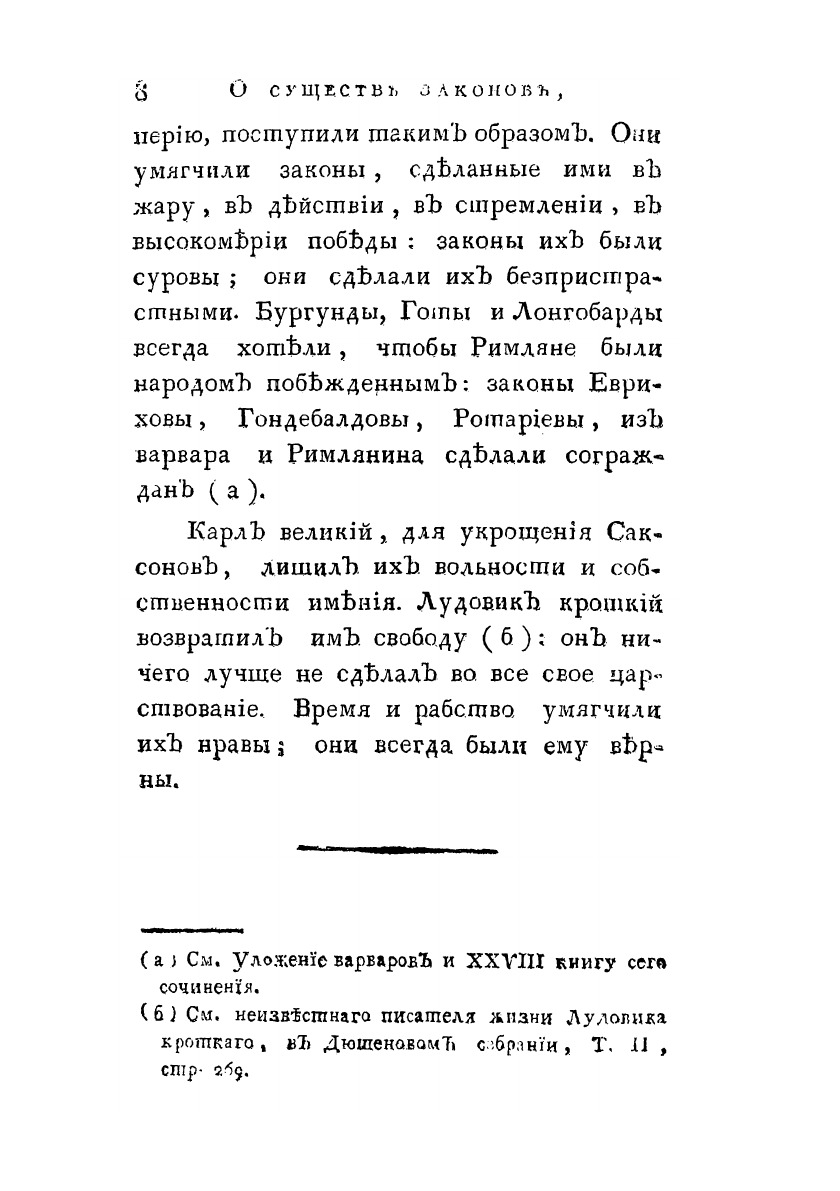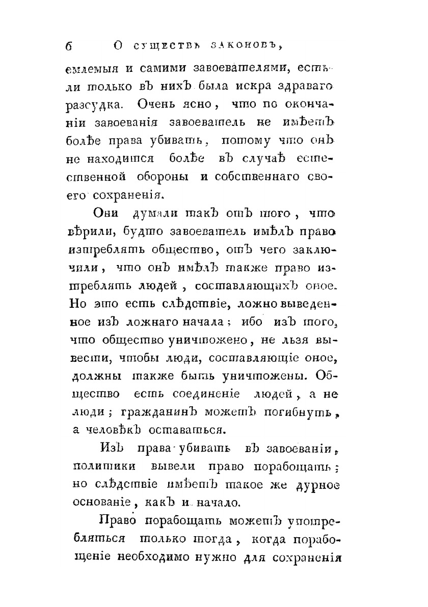 Перевод с французского. Творение г. Монтескье. Издал Василий Соликов.Развернуто и последовательно гуманистическая и просветительская позиция Монтескье представлена в трактате "О духе законов" (1748). Эта книга, сделавшая Монтескье одним из авторитетных классиков во всемирной истории политической и правовой мысли, была издана в России под названием "О существе законов".