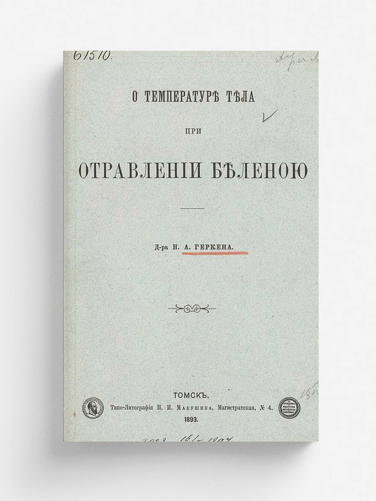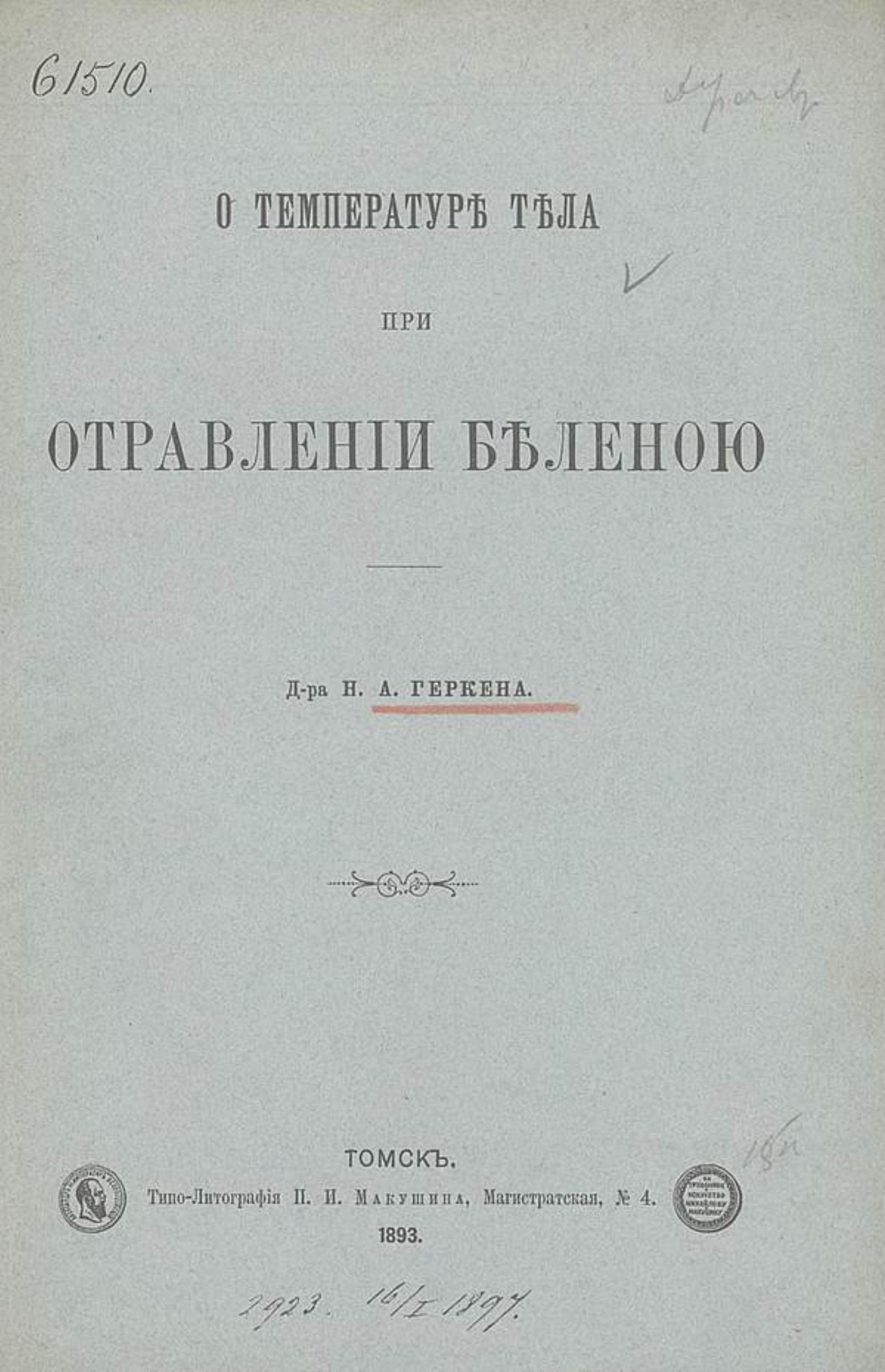 Геркен Н. А. О температуре тела при отравлении беленою : (сообщено в заседании Томского общества естествоисп. и врачей 22 декабря 1892 г.) / [соч.] Н. А. Геркена. — Томск : Типо-лит. П. И. Макушина, 1893.