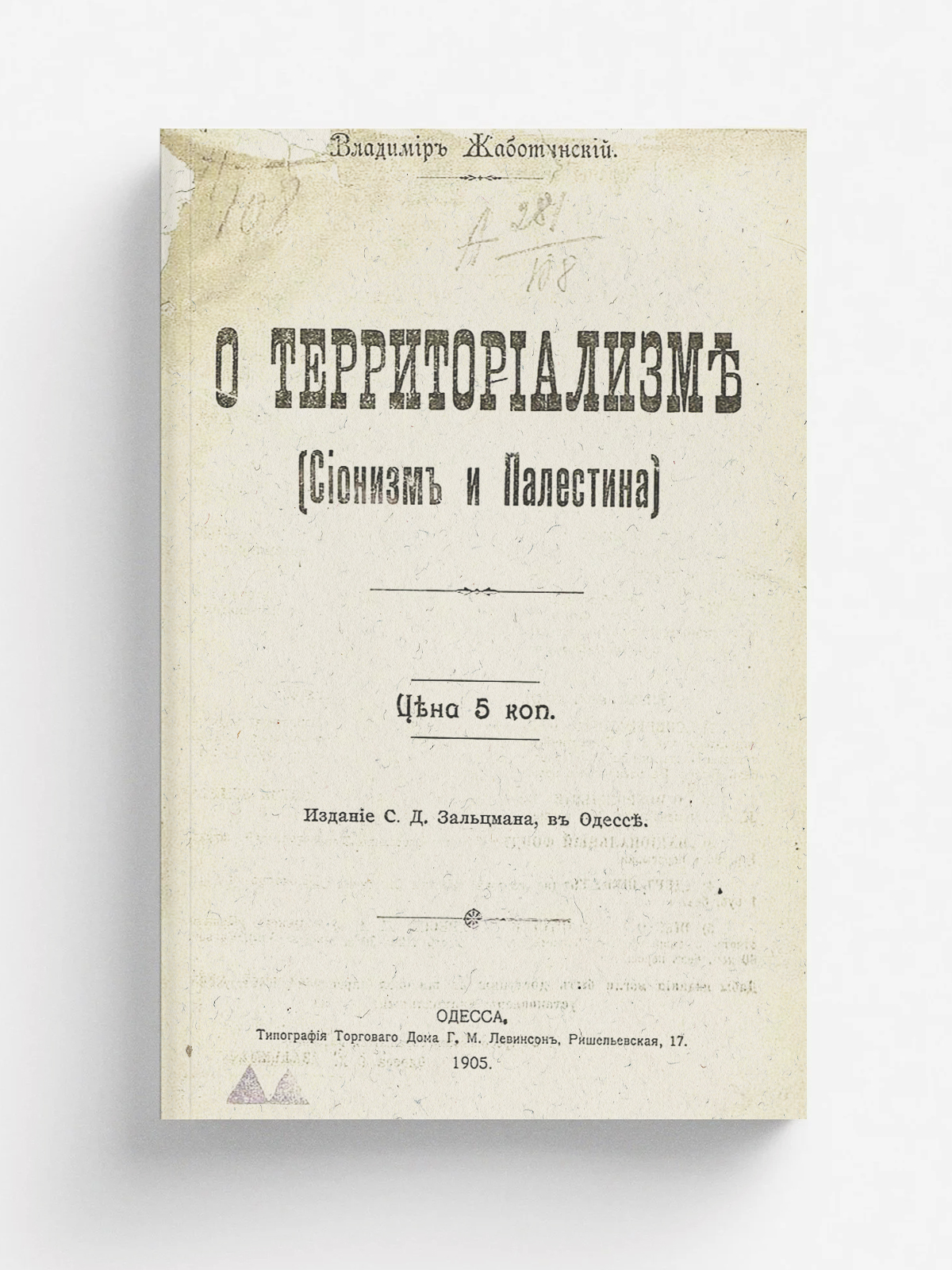 Жаботинский, Владимир Евгеньевич (1880–1940). О территориализме : (сионизм и Палестина) / Владимир Жаботинский. — Одесса : издание С. Д. Зальцмана, 1905 (Тип. Торговаго Дома Г. М. Левинсон). — 23 с.; 21 см.