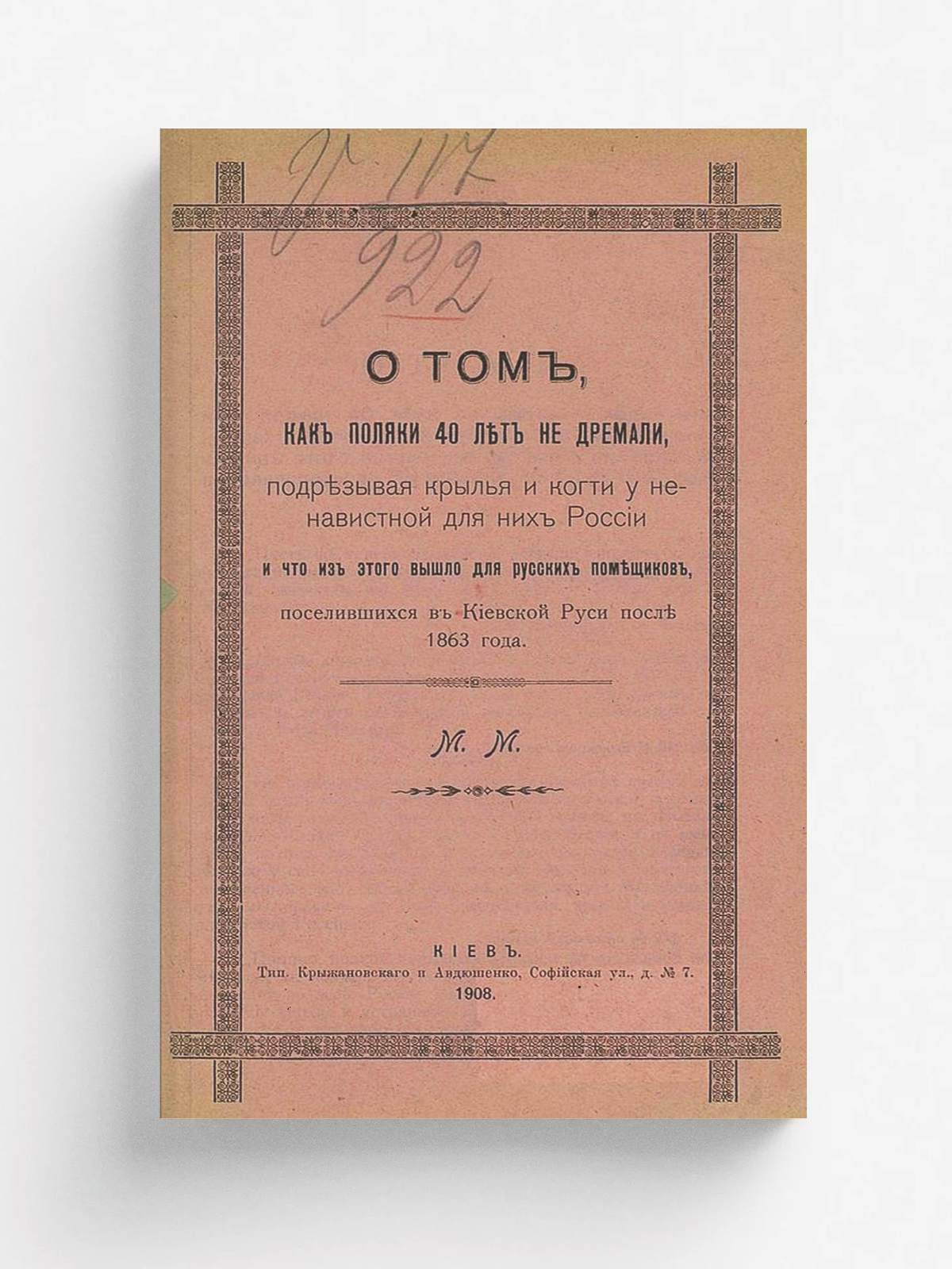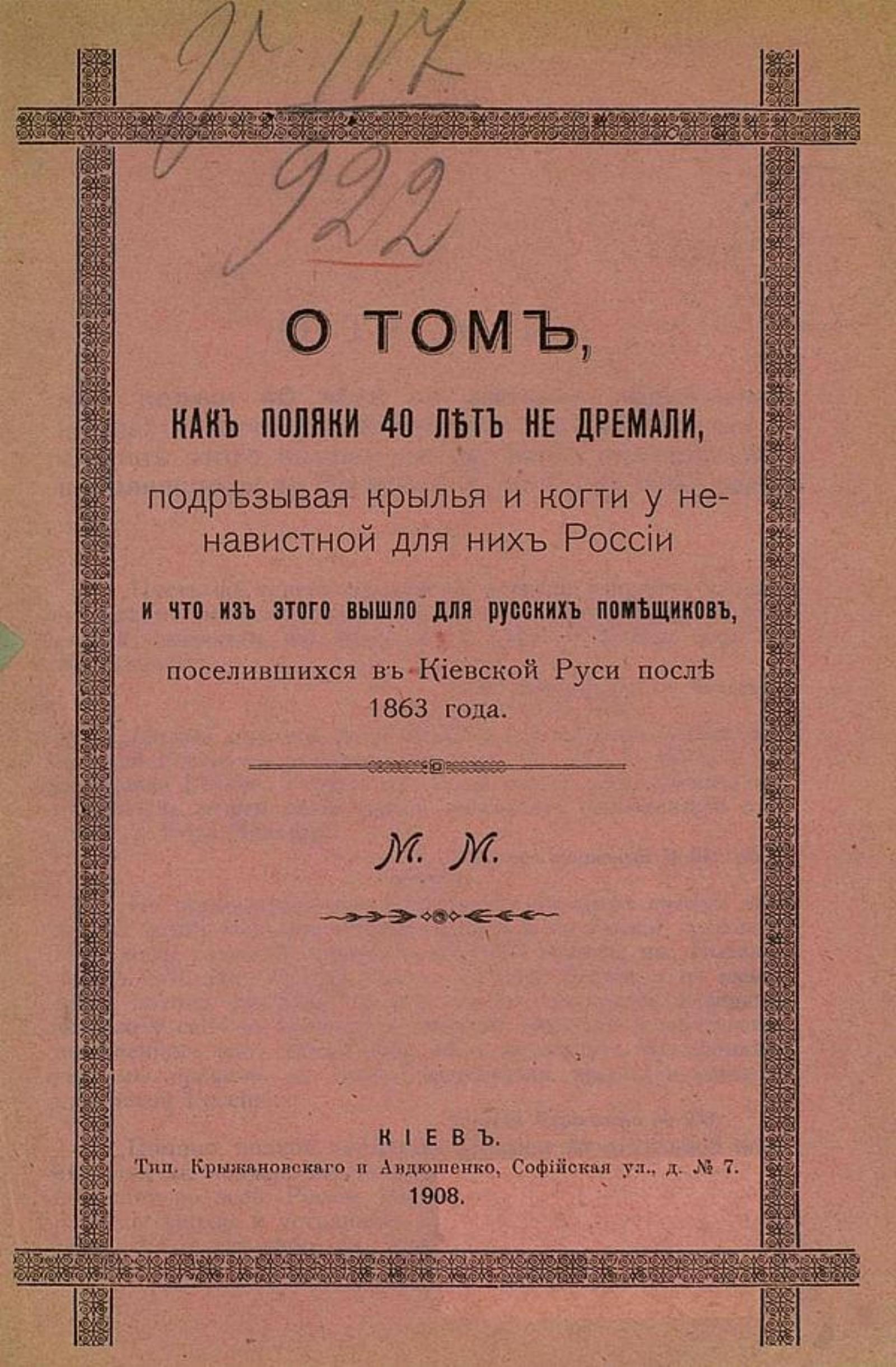 Юзефович, Борис Михайлович (1843–1911). О том, как поляки 40 лет не дремали, подрезывая крылья и когти у ненавистной для них России, и как они грабили русских помещиков, поселившихся в Киевской Руси после 1863 года / М. М. - Киев : тип. Крыжановского и Авдюшенко, 1908. - 16 с.; 22.