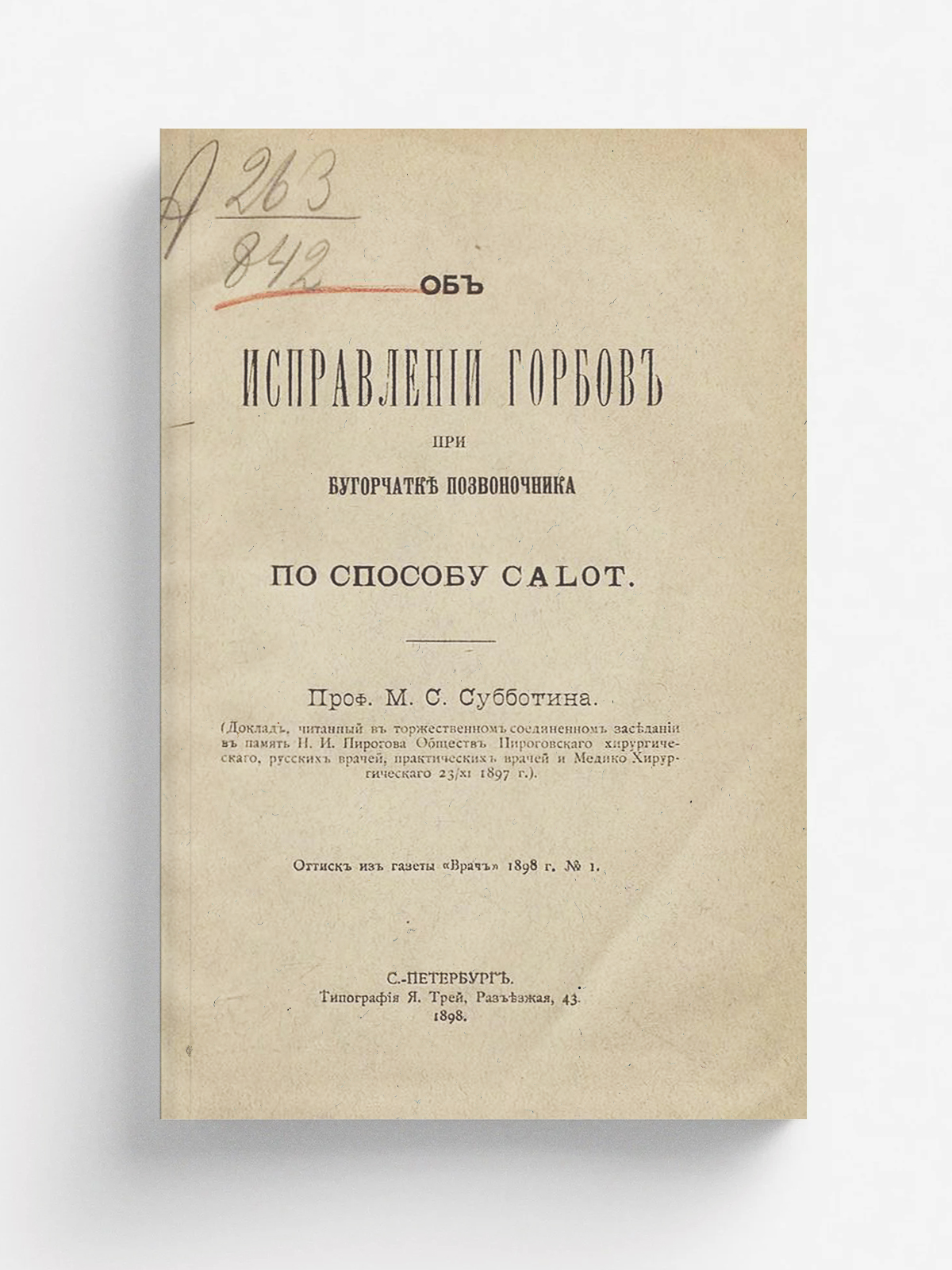 Субботин, Максим Семенович (1848–1913). Об исправлении горбов при бугорчатке позвоночника по способу Calot: (Докл., чит. в торжеств. соедин. заседании в память Н. И. Пирогова о-в Пирогов. хирург. рус. врачей, практ. врачей и медико-хирург. 23/11 1897 г.) / [Соч.] Проф. М. С. Субботина. — Санкт-Петербург: тип. Я. Трей, 1898. — 14 с. : ил.; 21.