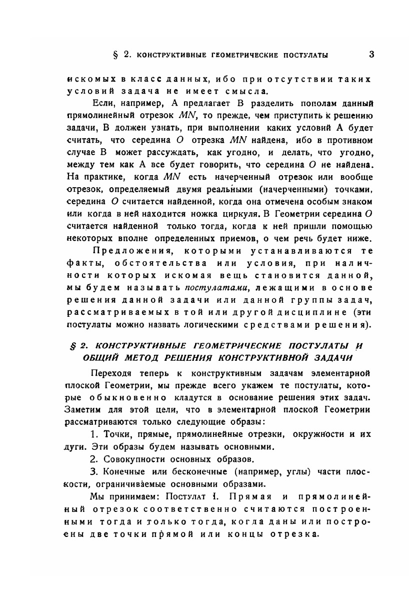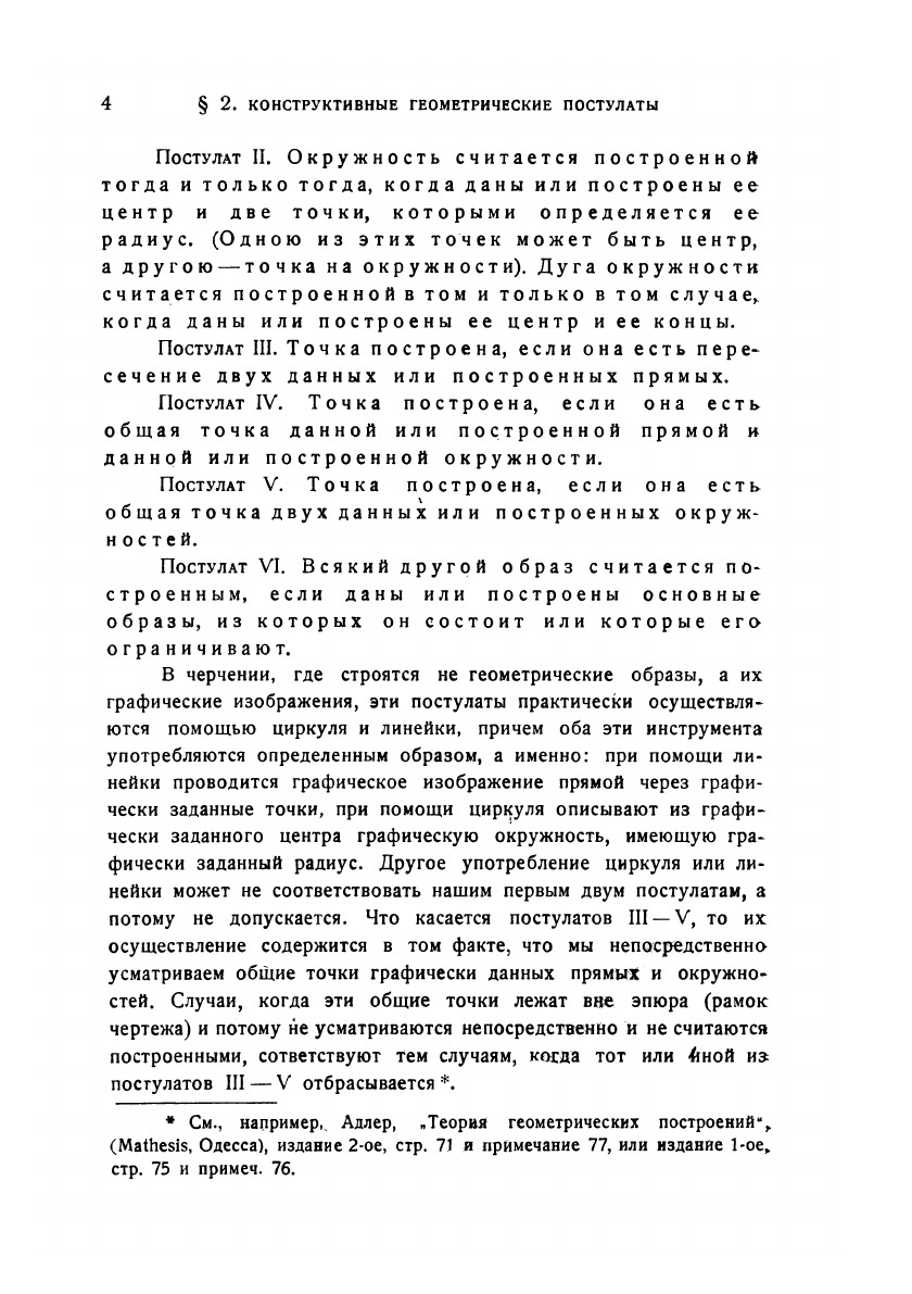 В этой книжке (её первые десять страниц составляли раньше введение к первому изданию книги Адлера "Теория геометрических построений") я имею в виду дать в общедоступном изложении общую теорию решения конструктивных задач Элементарной Геометрии.Эта почти законченная в науке теория характеризуется не только глубиной идей, лежащих в её основе, но и тем, что, охватывая материал во всём его объёме, ставя и решая задачу в наиболее общем виде, она весьма просто приводит в частности к решению конструктивных задач, ожидавших своего решения в течение многих и многих столетий, каковы, например, получившие отрицательные решения задачи о трисекции угла, удвоении куба, квадратуре круга и т.д.