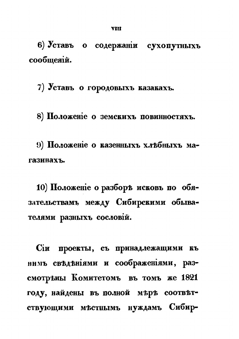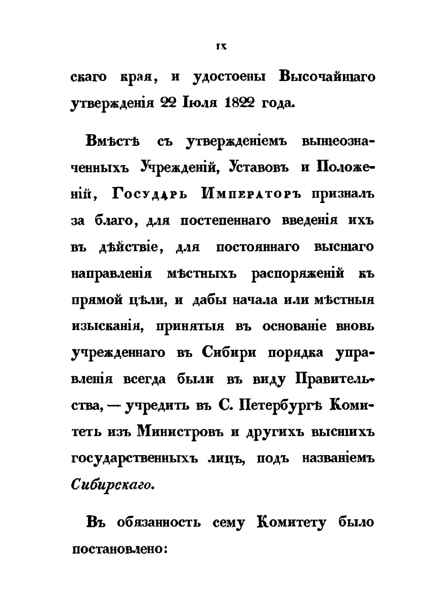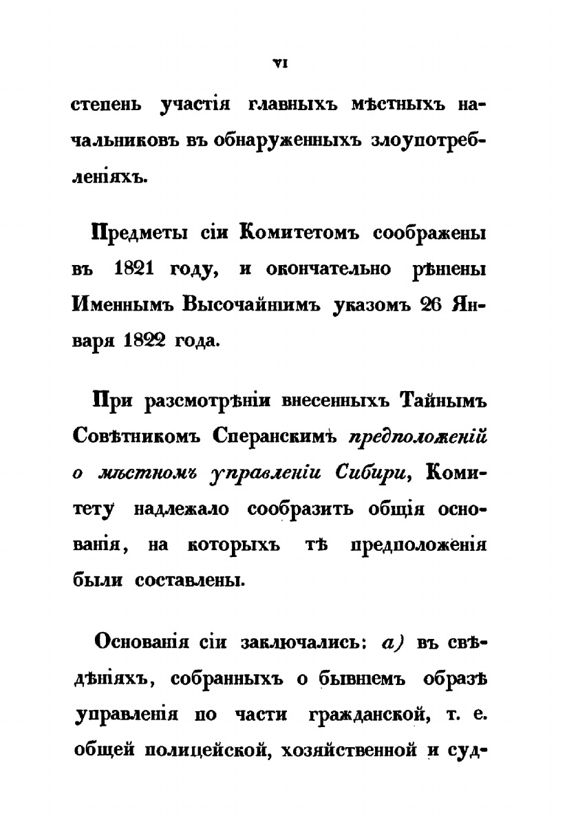 «Обозрение главных оснований местного управления Сибири».49 «Обозрение», подготовленное II Отделением Собственной его императорского величества канцелярией, посвящено преобразованиям административного устройства Сибири в рамках Сибирской реформы 1822 года. В публикации кратко изложено мнение М.М.Сперанского о недостатках системы управления Сибирью, основные идеи, положенные им в основу подготовленных для Сибири законопроектов. Наконец, здесь же перечислены названия данных законопроектов. Для нас важно и то, что в «Обозрении» коротко рассматриваются цели и задачи, стоящие перед I Сибирским комитетом.