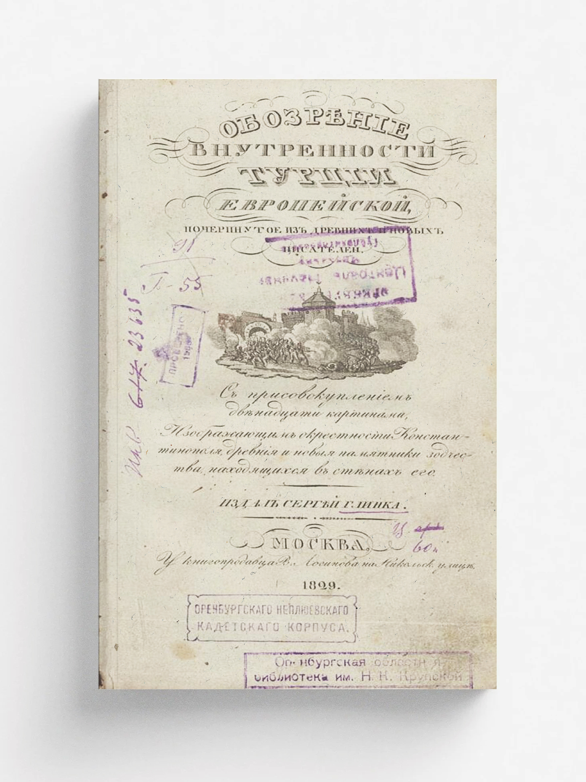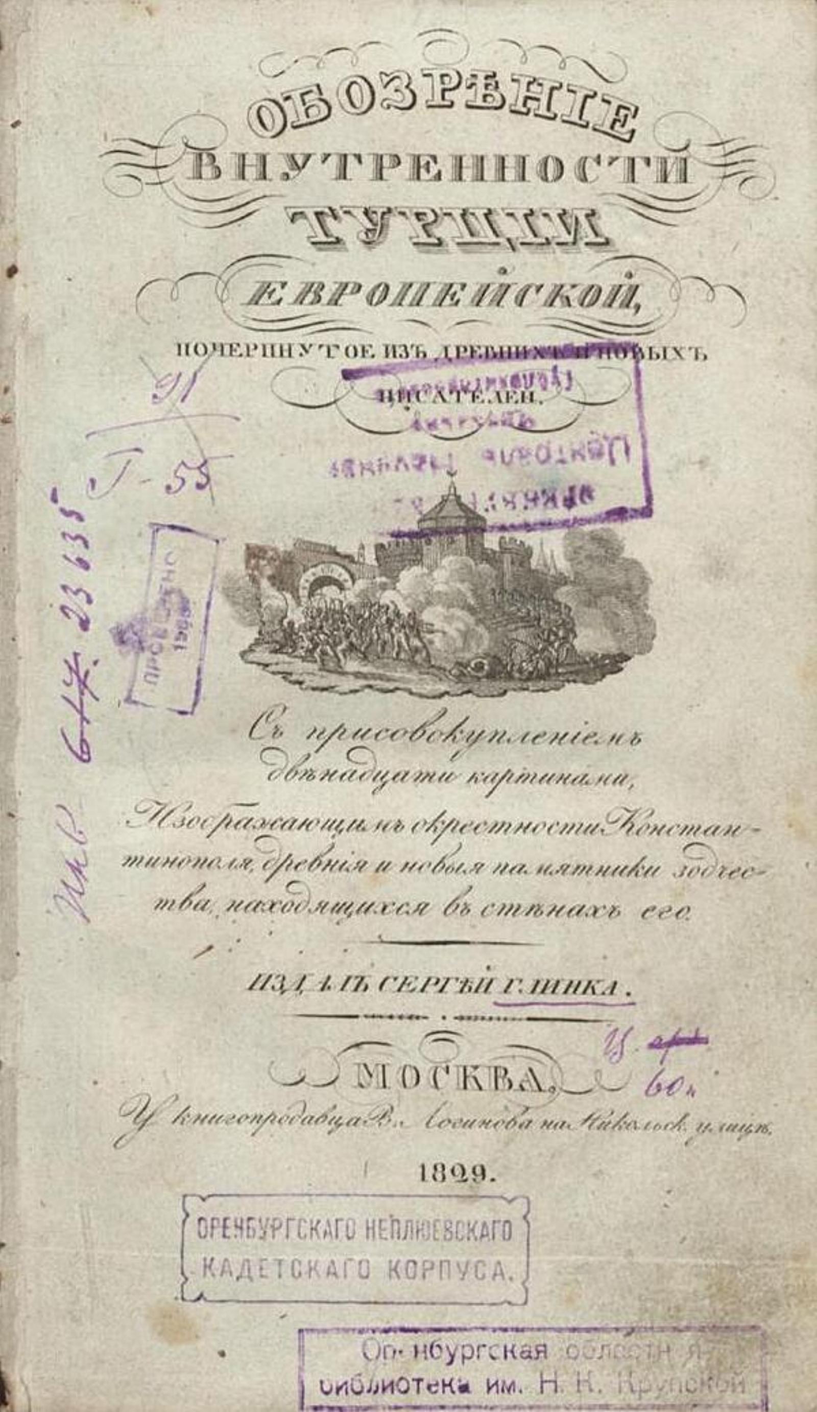 Обозрение внутренности Турции Европейской, почерпнутое из древних и новых писателей : с присовокуплением 12 картинок, изображающих окрестности Константинополя, древние и новые памятники зодчества, находящиеся в стенах его / издал Сергей Глинка. — Москва : Типография Решетникова, 1829. — 129 с. : ил.