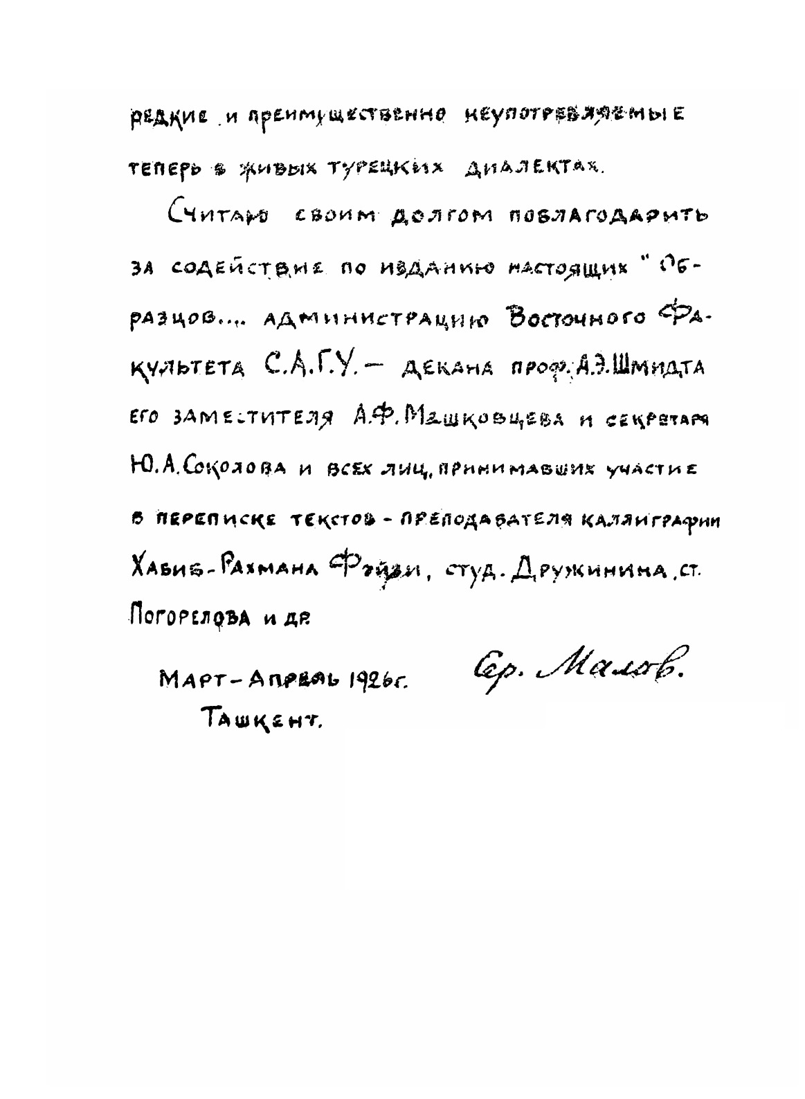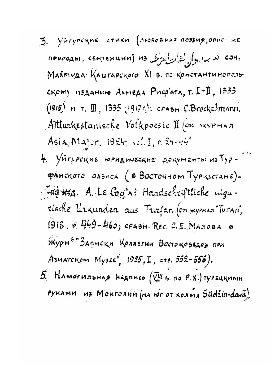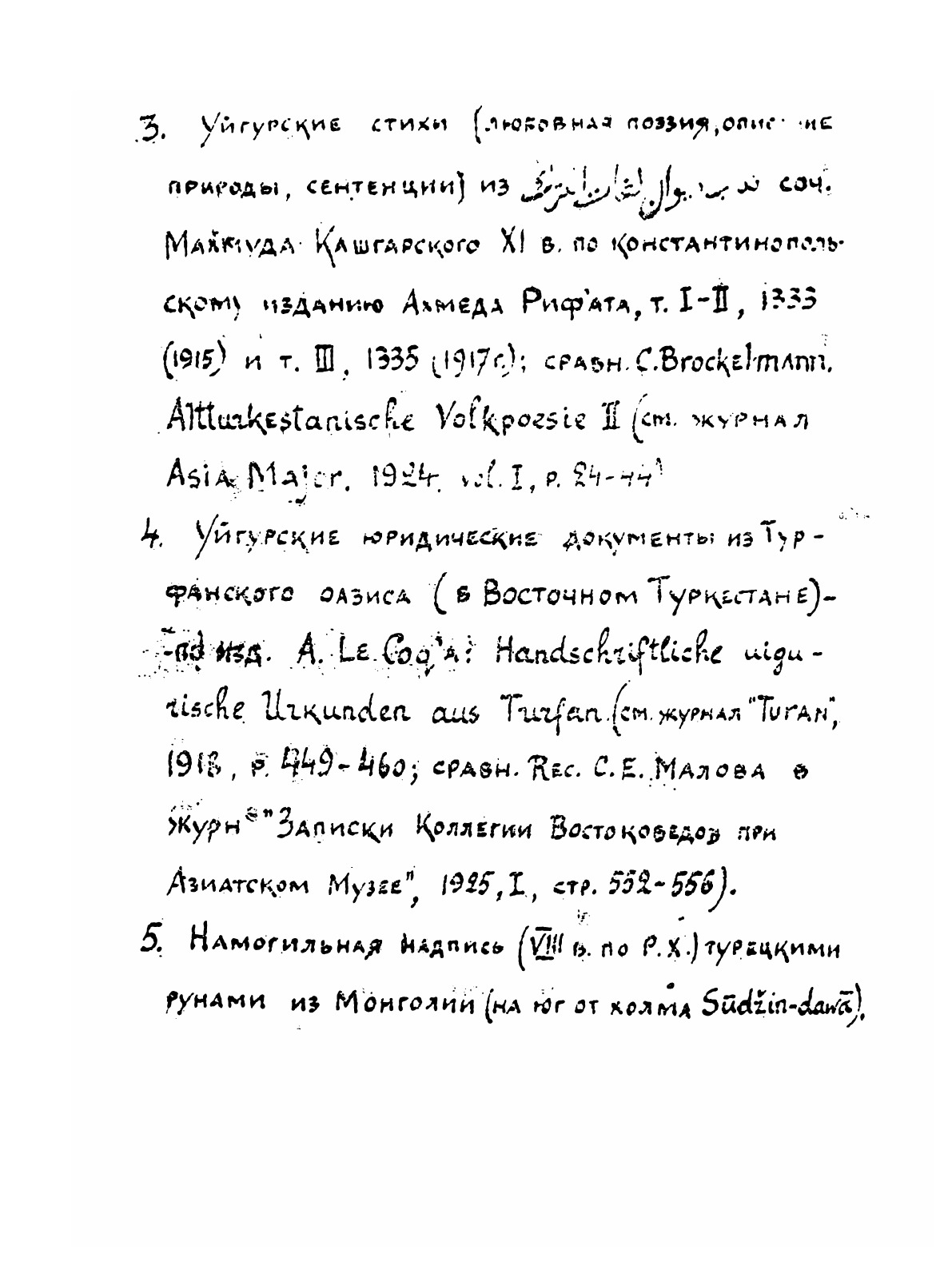 "Образцы древне-турецкой письменности с предисловием и словарем" (Ташкент, "Издание Восточного факультета САГУ, 1926 г.) - размноженная на ротаторе рукописная брошюра. Первая учебная хрестоматия, включившая в себя практически все известные к тому времени древнетюркские памятники, как рунические, так и выполненные арабской графикой - а также их современную транскрипцию, русский перевод и необходимый словарь.