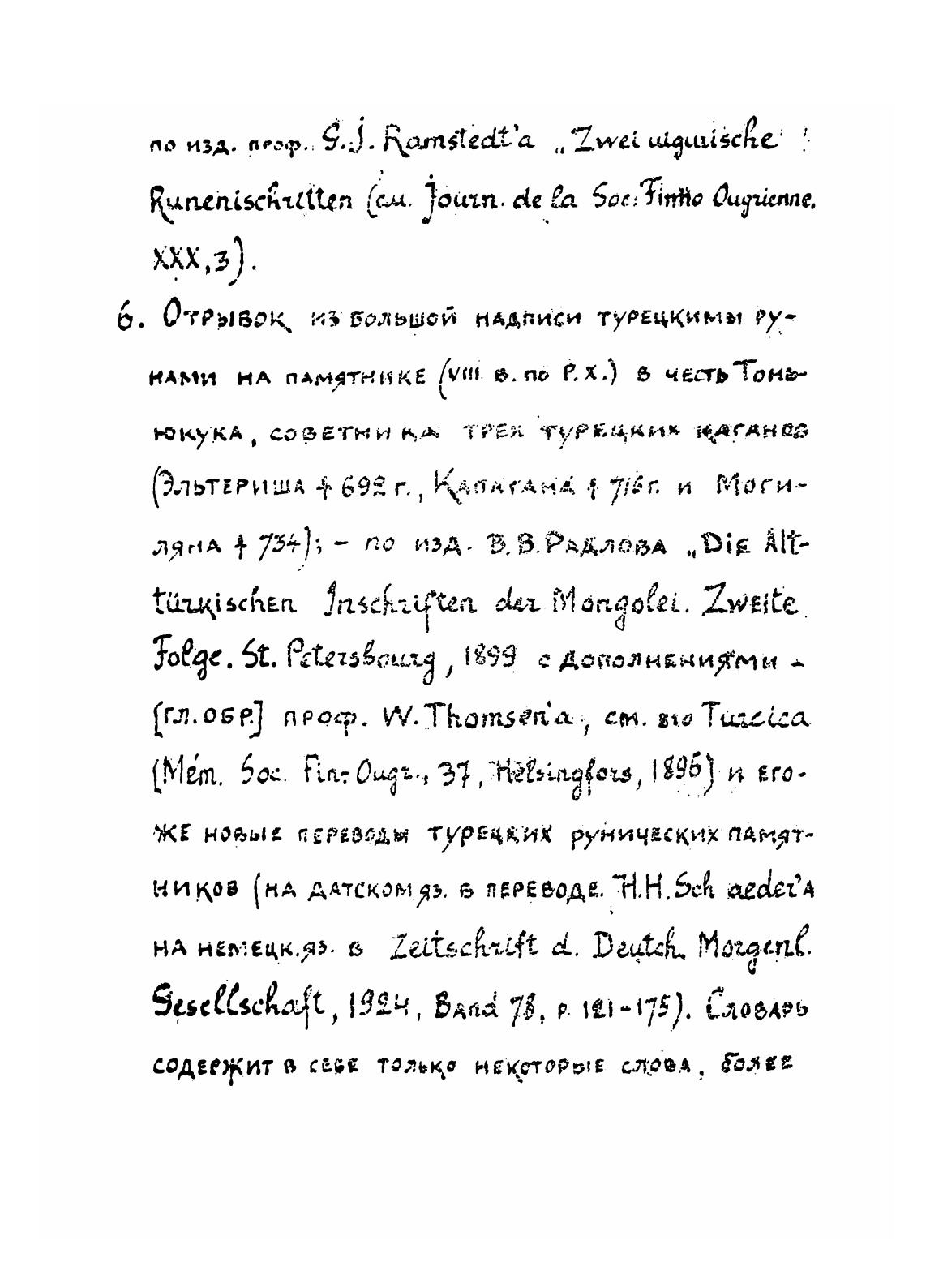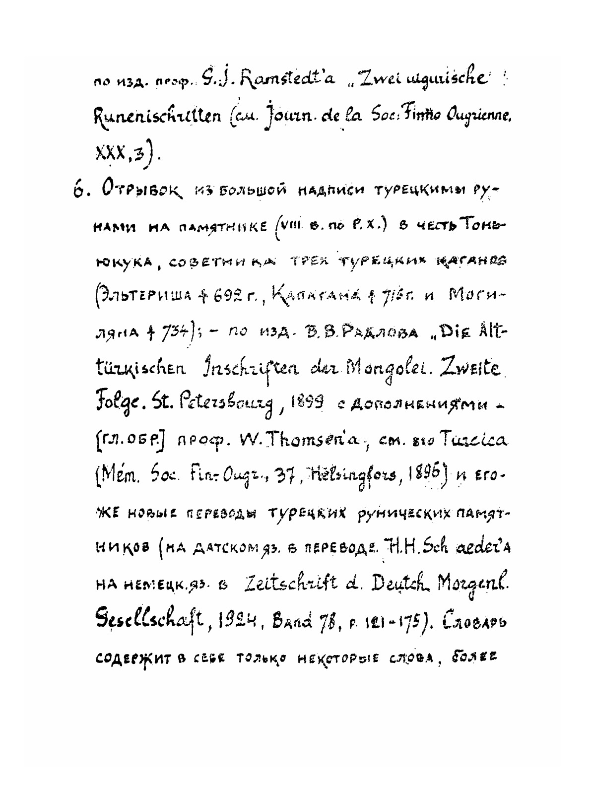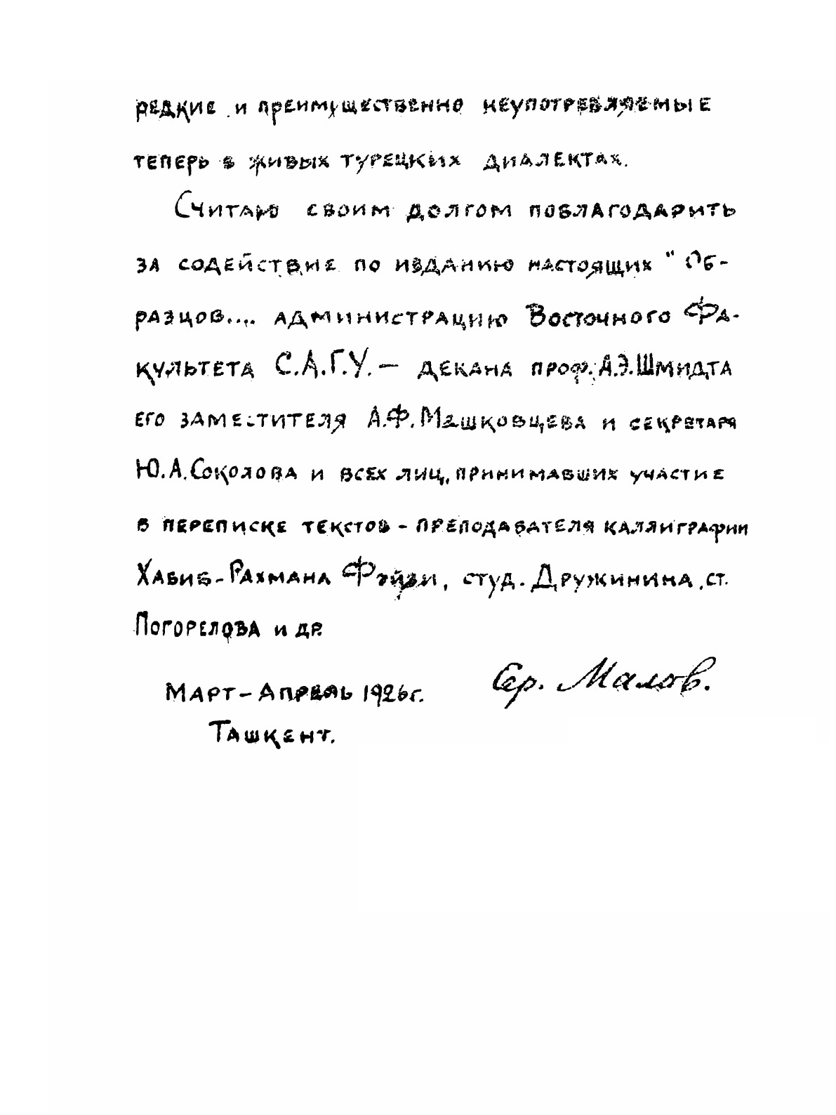 "Образцы древне-турецкой письменности с предисловием и словарем" (Ташкент, "Издание Восточного факультета САГУ, 1926 г.) - размноженная на ротаторе рукописная брошюра. Первая учебная хрестоматия, включившая в себя практически все известные к тому времени древнетюркские памятники, как рунические, так и выполненные арабской графикой - а также их современную транскрипцию, русский перевод и необходимый словарь.