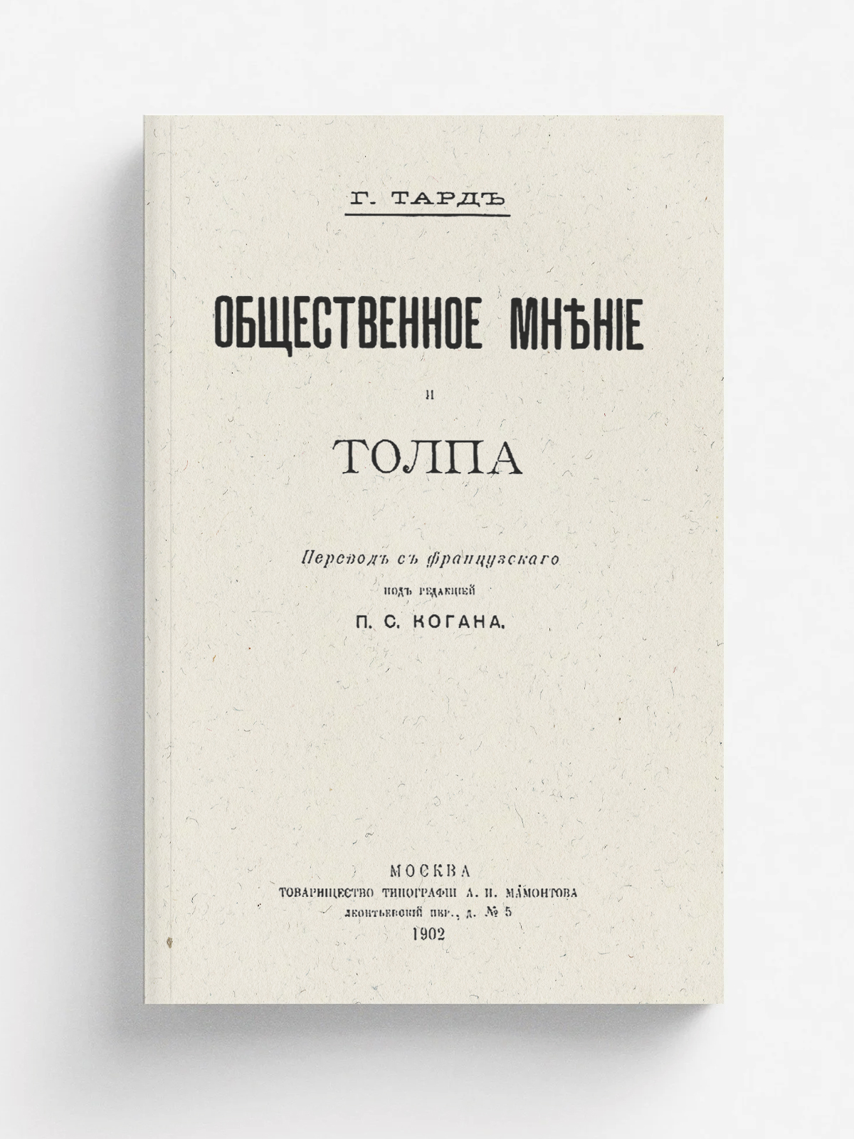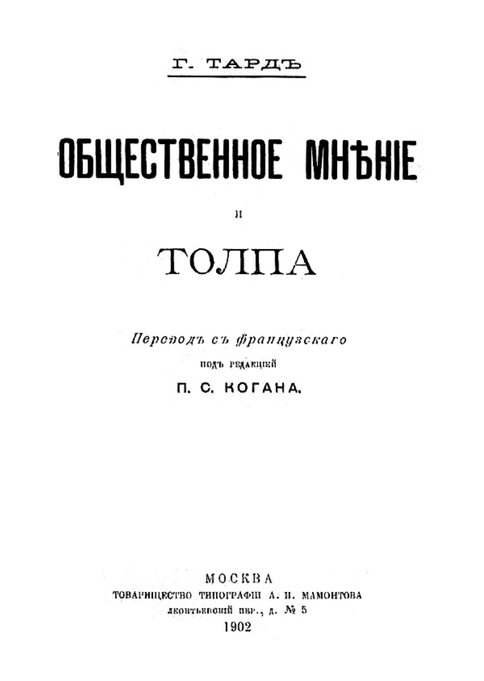 Тард, Габриэль де (1843–1904). Общественное мнение и толпа / Г. Тард; Пер. с фр. под ред. П. С. Когана. — Москва : т-во тип. А. И. Мамонтова, 1902. — IV, 201 с.; 21.