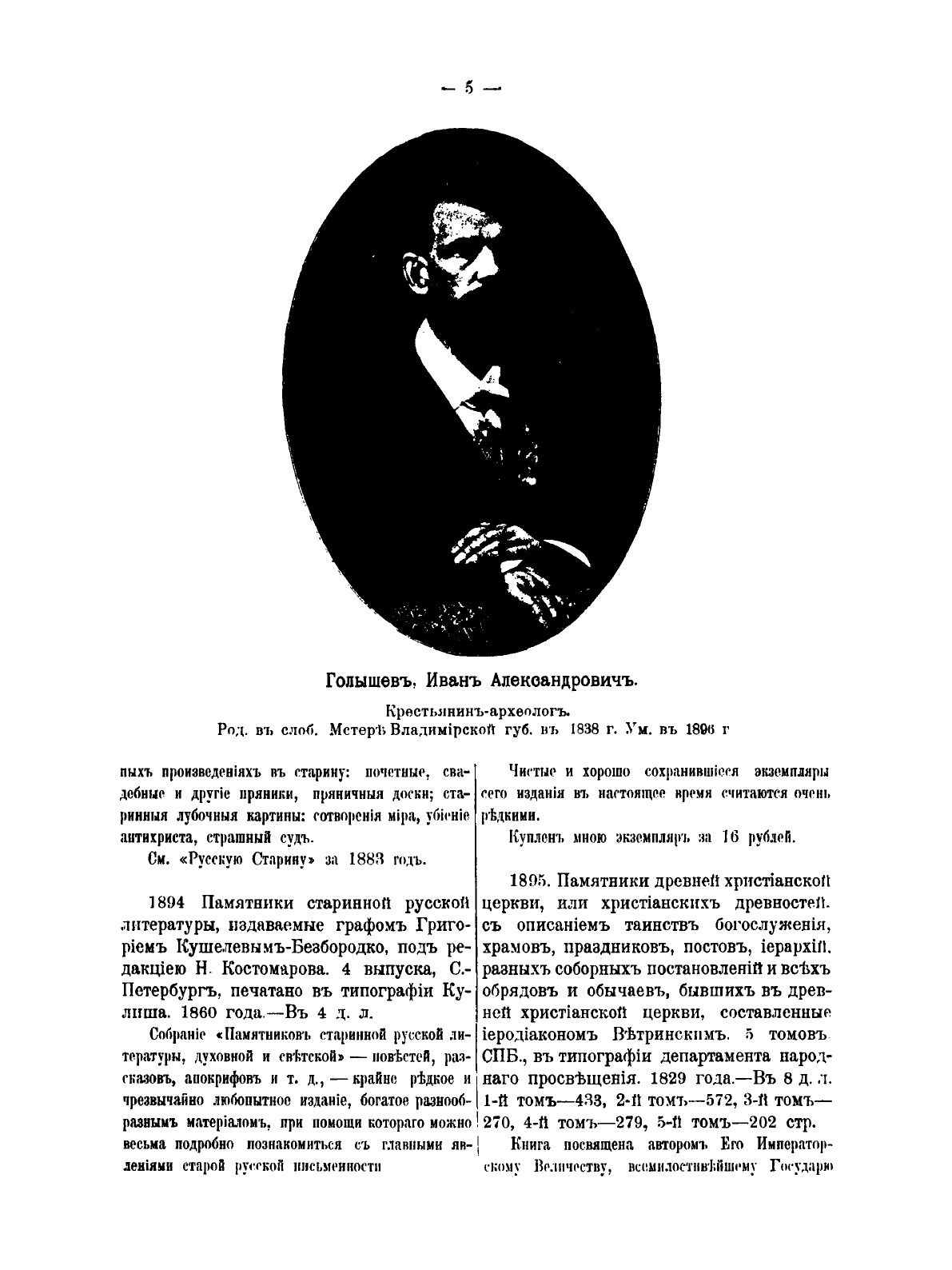 Обстоятельное библиографическое описание редких и замечательных книг, брошюр, художественных изданий, старых и новых рукописей, гравюр, грамот, портретов, лубочных картинок, указов и разных летучих листов, с пояснительными замечаниями и полными перепечатками более редких книг и др. библиографических материалов.Том 5