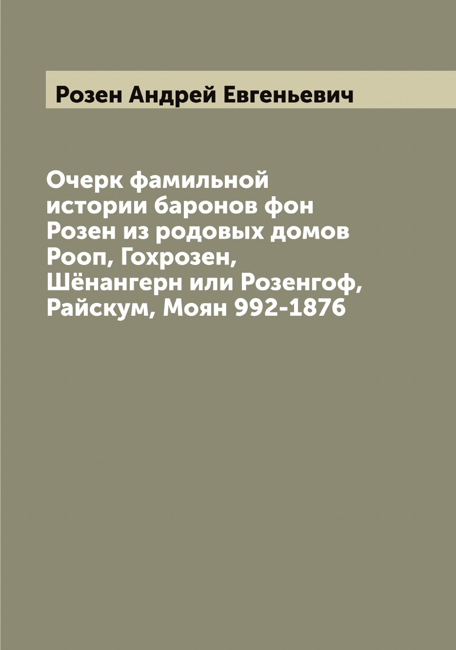 Печатная книга «Очерк фамильной истории баронов фон Розен из родовых домов Рооп, Гохрозен, Шёнангерн или Розенгоф, Райскум, Моян 992-1876» в мягкой обложке, язык - русский. В книге 90 страниц, она напечатана на белой офсетной бумаге плотностью 80 г/м². Формат издания — 165x235 мм. Все книги аккуратно упаковываем в прочный трёхслойный непрозрачный картонный конверт.