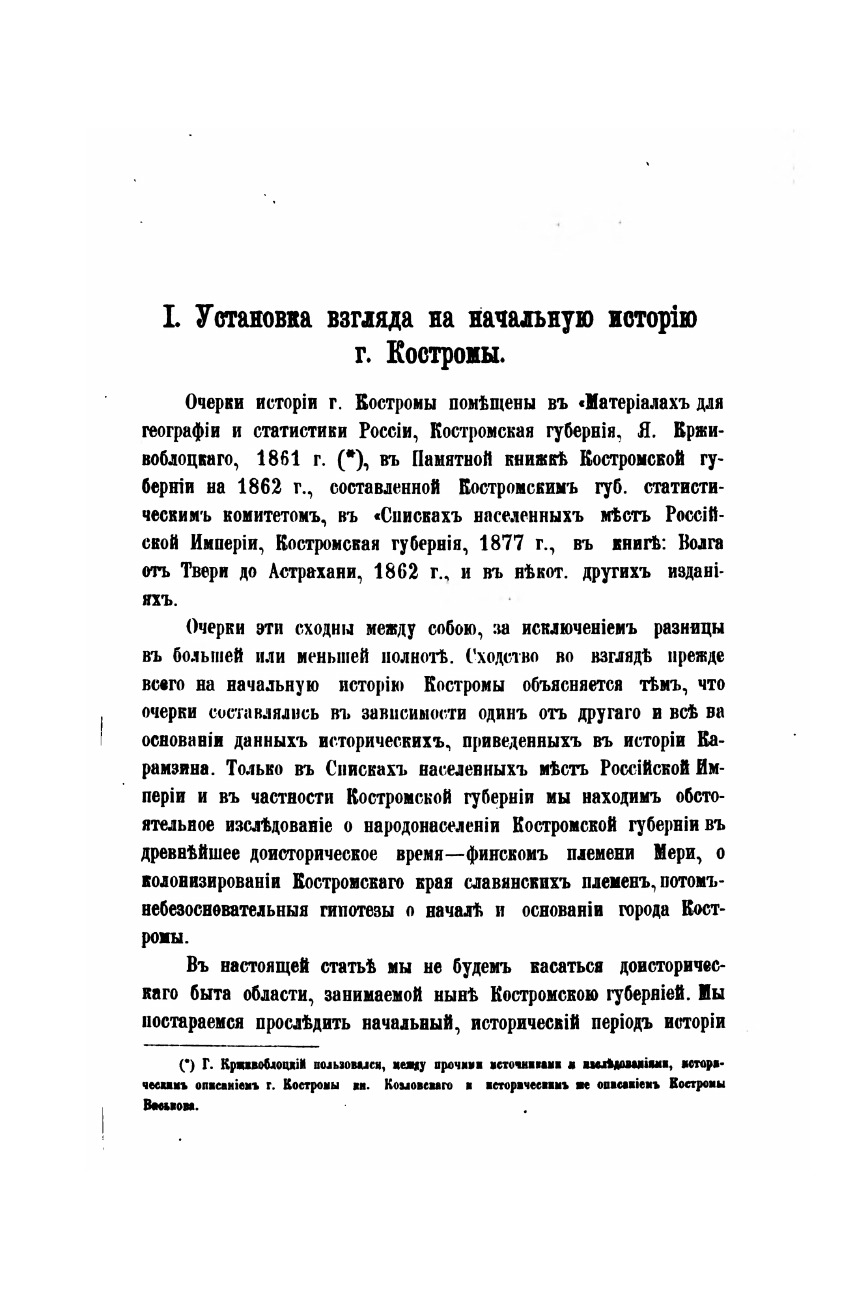 По современной автору официальной версии, выдвинутой еще Василием Татищевым, Кострома была основана князем Юрием Долгоруким в 1152 году (несмотря на то, что в Воскресенской и Тверской летописях город впервые упоминается только в 1213 году). Член Костромской ученой губернской архивной комиссии Иван Васильевич Миловидов получил известность среди российских историков, археологов и читающей публики, выдвинув в 1886 году собственную гипотезу, что город на Волге был основан еще в середине IX века как поселение со смешанным славяно-мерянским населением, а свое название - Кострома, получил от имени одноименного славянского божества. При всей уязвимости авторской аргументации она надолго закрепилась в популярной историографии.