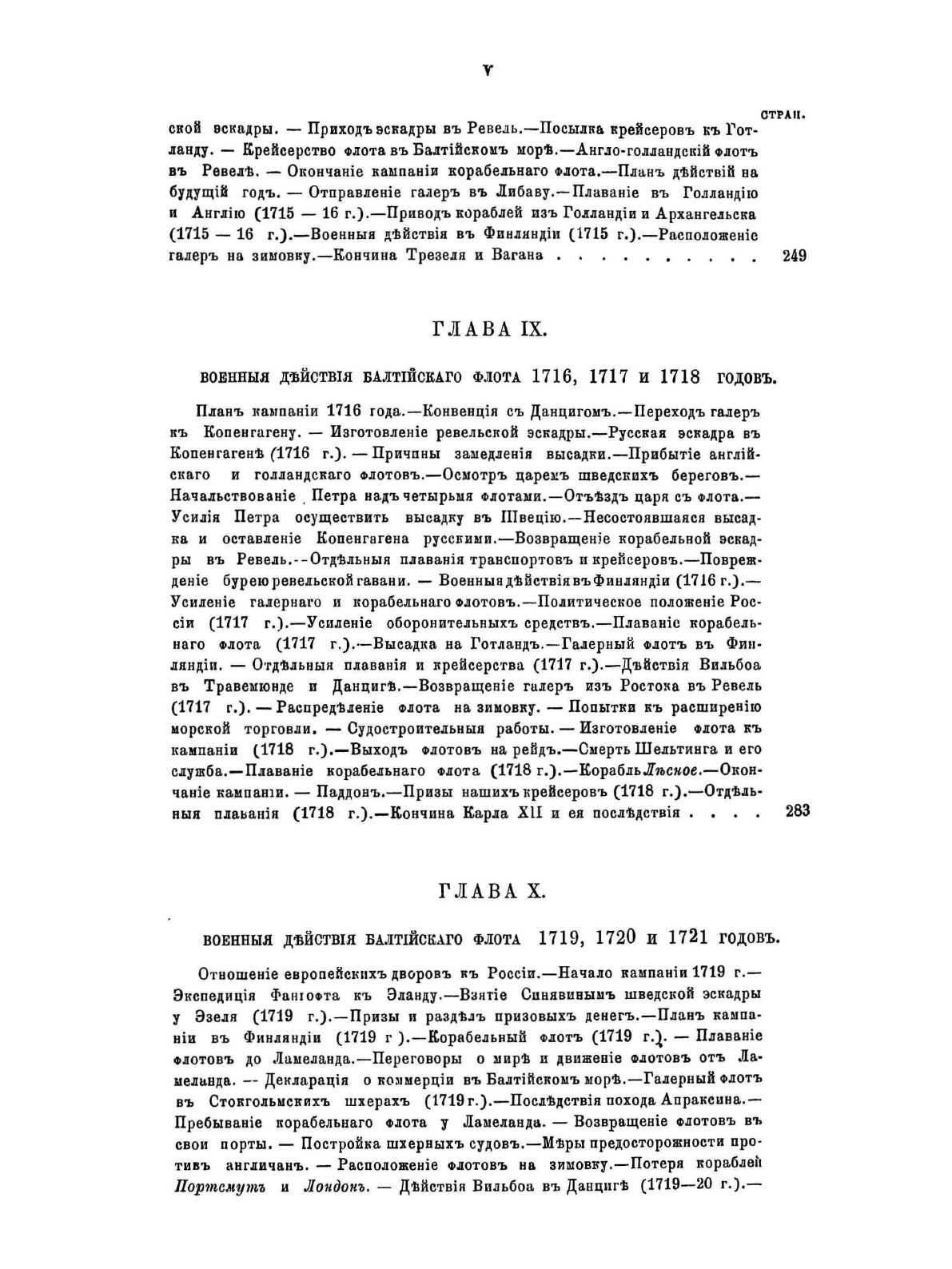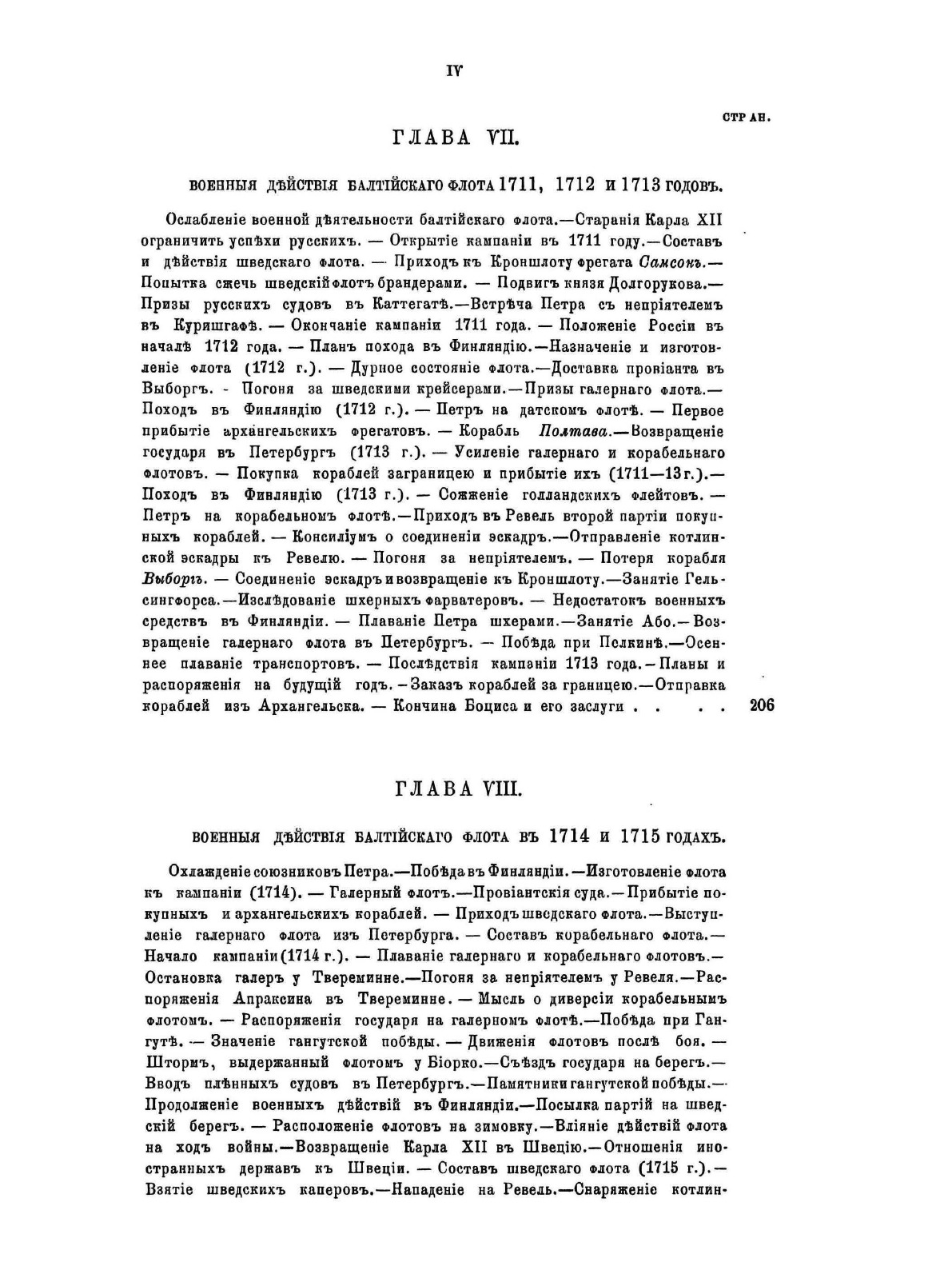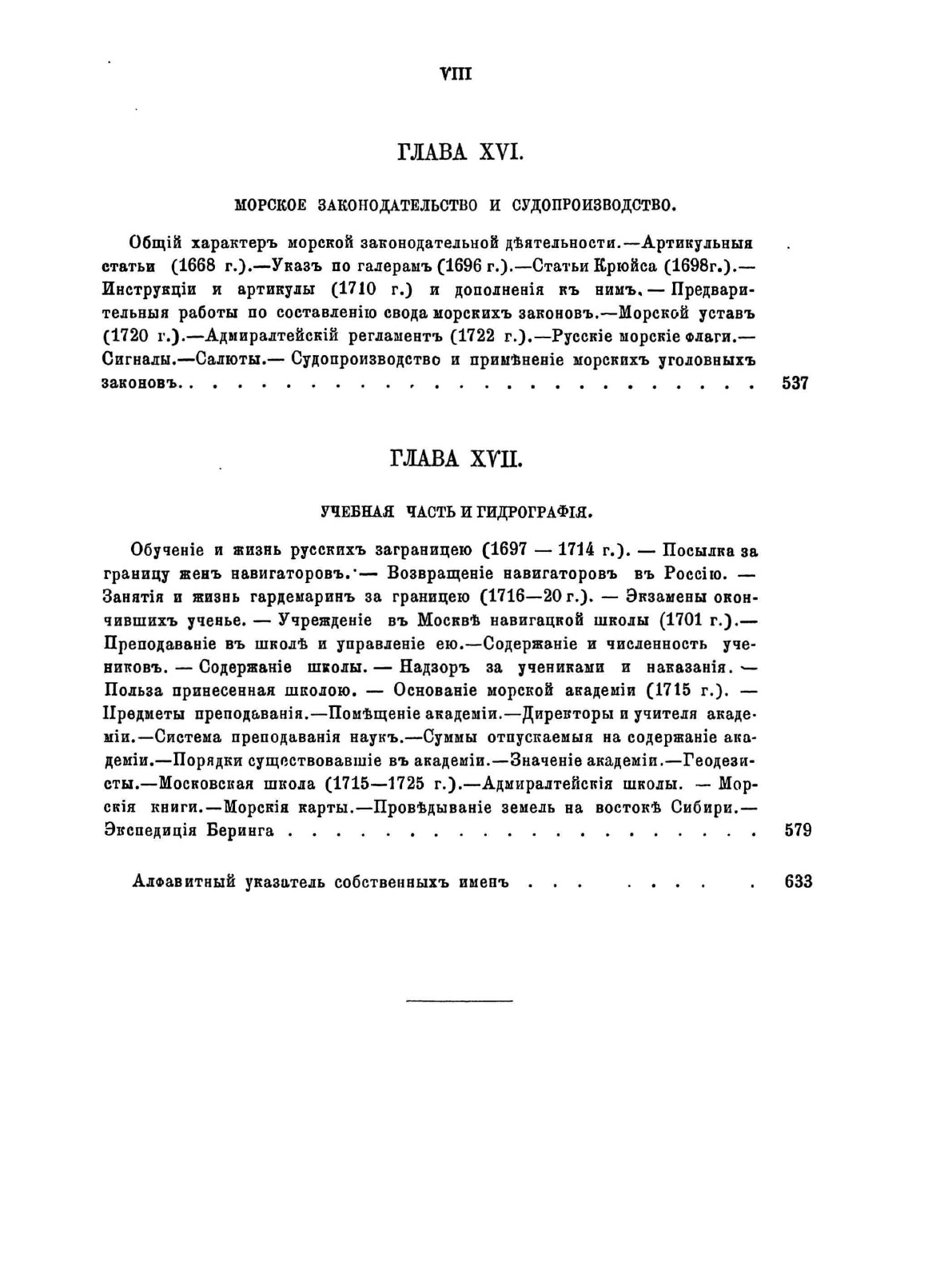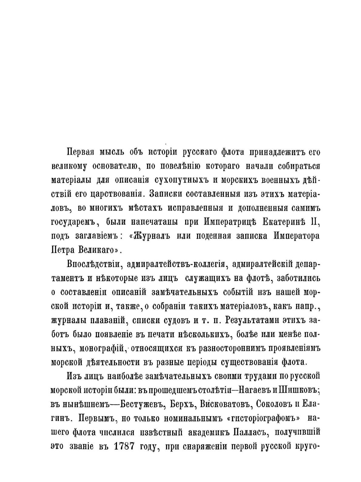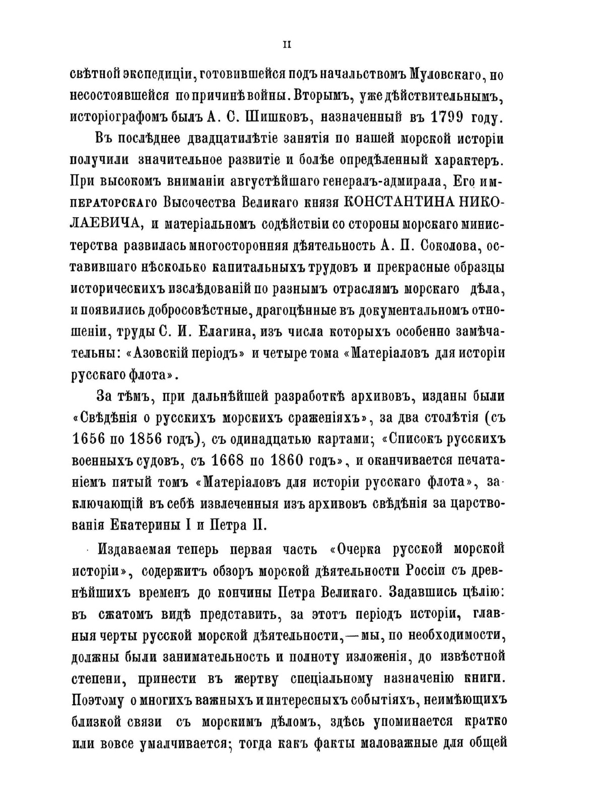Первая часть «Очерка русской морской истории» содержит обзор морской деятельности России с древнейших времен до кончины Петра Великого. Автор работы, военно-морской историк Ф. Ф. Веселаго, задавался целью в сжатом виде представить за этот период истории главные черты русской морской деятельности. В первых двенадцати главах в хронологическом порядке изложены события, относящиеся преимущественно до русской военно-морской истории. В последних же пяти сгруппированы описания других родов морской деятельности, имеющих значение для истории русского флота.