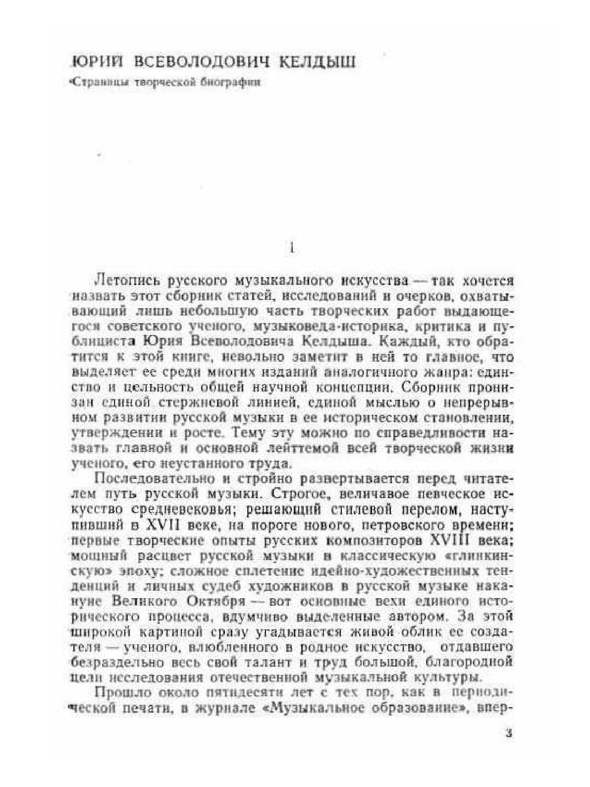 Летопись русского музыкального искусства - так хочется назвать этот сборник статей, исследований и очерков, охватывающий лишь небольшую часть творческих работ выдающегося советского учёного, музыковеда-историка, критика и публициста Юрия Всеволодовича Келдыша. Каждый кто обратится к этой книге, невольно заметит в ней то главное, что выделяет её среди многих изданий аналогичного жанра: единство и цельность общей научной концепции. Последовательно и стройно развёртывается перед читателем путь русской музыки. Строгое величавое певческое искусство средневековья; решающий стилевой перелом, наступивший в 17 веке, на пороге нового, петровского времени; первые творческие опыты русских композиторов 18 века, мощный рассвет русской музыки в классическую "глинкинскую" эпоху, а также многое другое вы найдёте в этой книге.