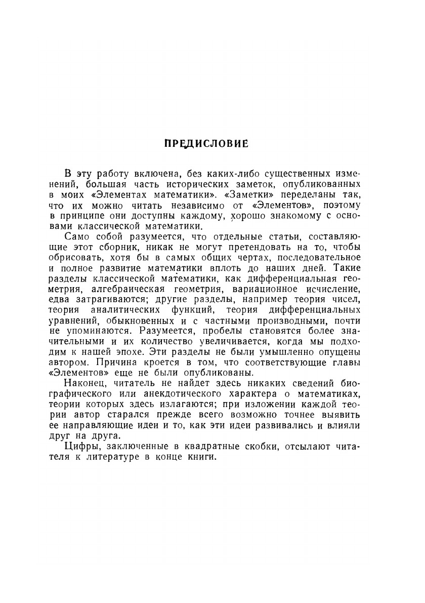 Предлагаемая читателям книга является частью многотомного сочинения "Элементы математики", выпускаемого группой крупных французских математиков, объединившихся под общим псевдонимом Никола Бурбаки.В эту работу включена, без каких-либо существенных изменений, большая часть исторических заметок, опубликованных в моих "Элементах математики" "Заметки" переделаны так, что их можно читать независимо от "Элементов", поэтому в принципе они доступны каждому, хорошо знакомому с основами классической математики.