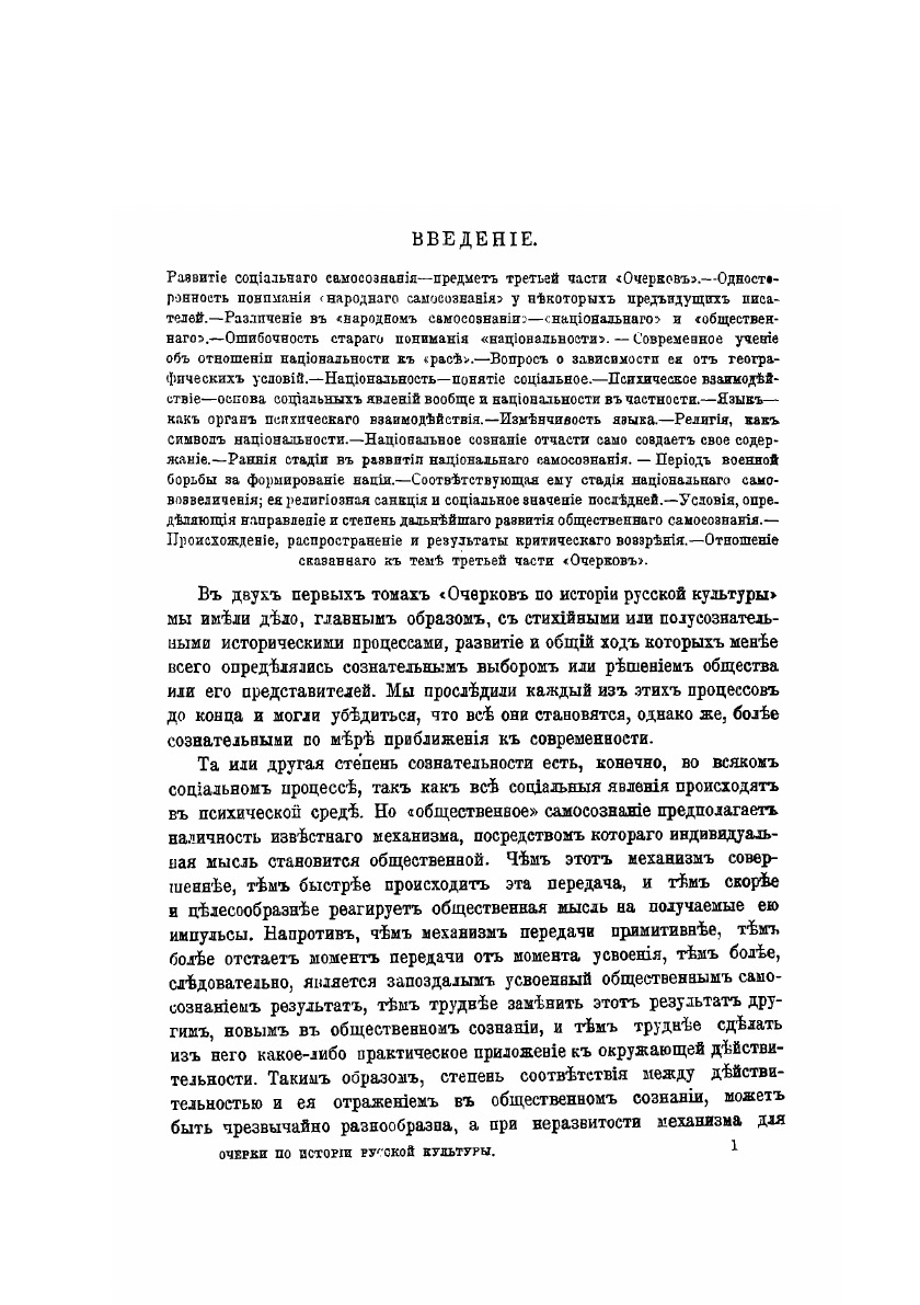 В «Очерках» Милюков показал большую роль государства в формировании русского общества, утверждая, что Россия, несмотря на свои особенности, шла европейским путем развития, а также привёл свои доводы относительно приспособляемости русского «национального типа» к заимствованным общественным институтам. Полагая, что «существует ряд основных закономерных эволюций разных сторон социальной жизни», Милюков не считал возможным объяснять исторический процесс развитием производства или «духовным началом». Он стремился рассматривать единую историю как ряд взаимосвязанных, но разных историй: политической, военной, культурной и других. Первая часть исследования знакомит нас «с тем историческим зданием, в котором провел свою жизнь русский народ». Здесь изложены «общие понятия» об истории, её задачах и методах научного познания, определены теоретические подходы автора к анализу исторического материала, а также представлены очерки о населении, экономическом, государственном и социальном строе.