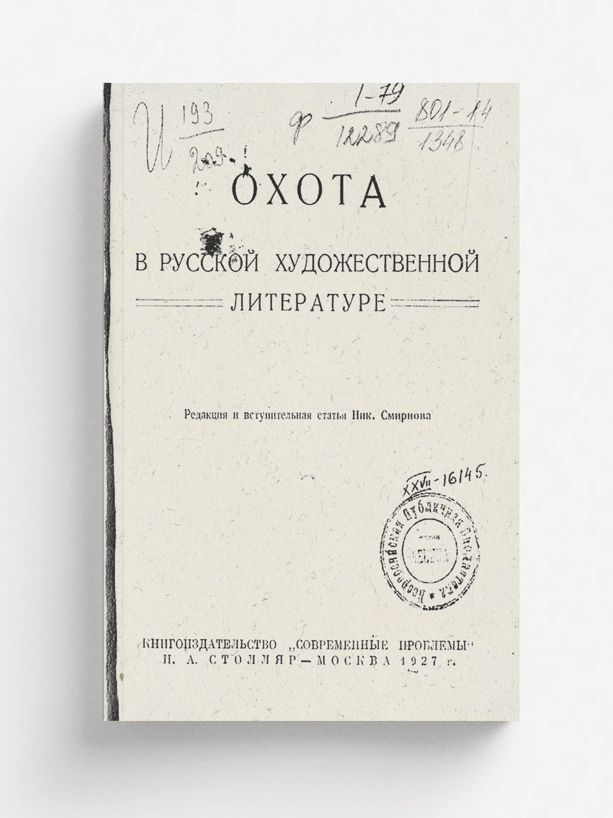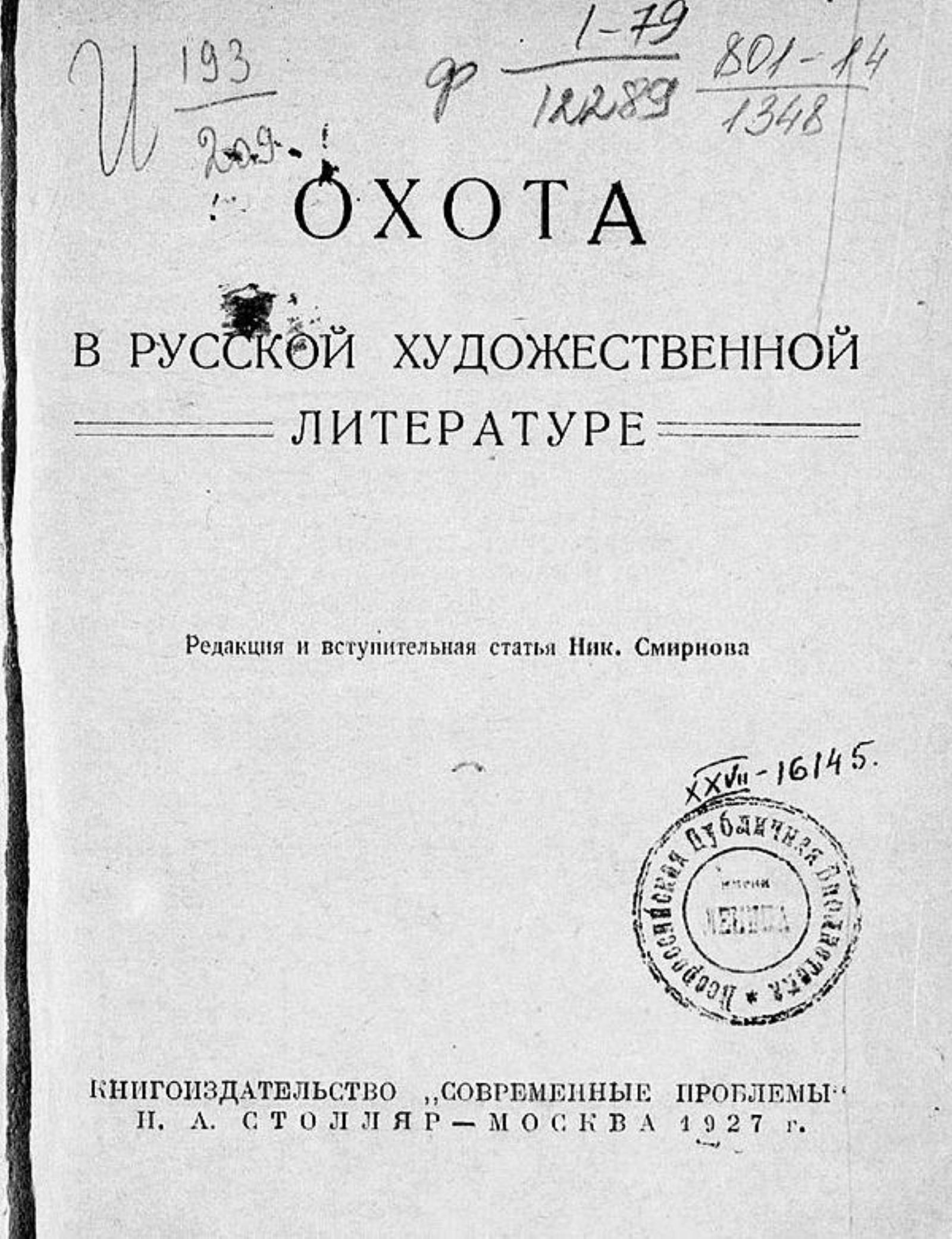 Охота в русской художественной литературе / редакция и вступительная статья Ник. Смирнова. — Москва: Книгоиздательство «Современные проблемы» Н. А. Столляр, 1927. — 381 с.; 17 см.