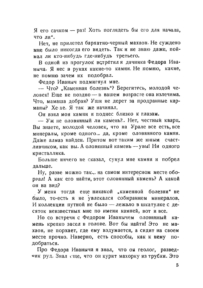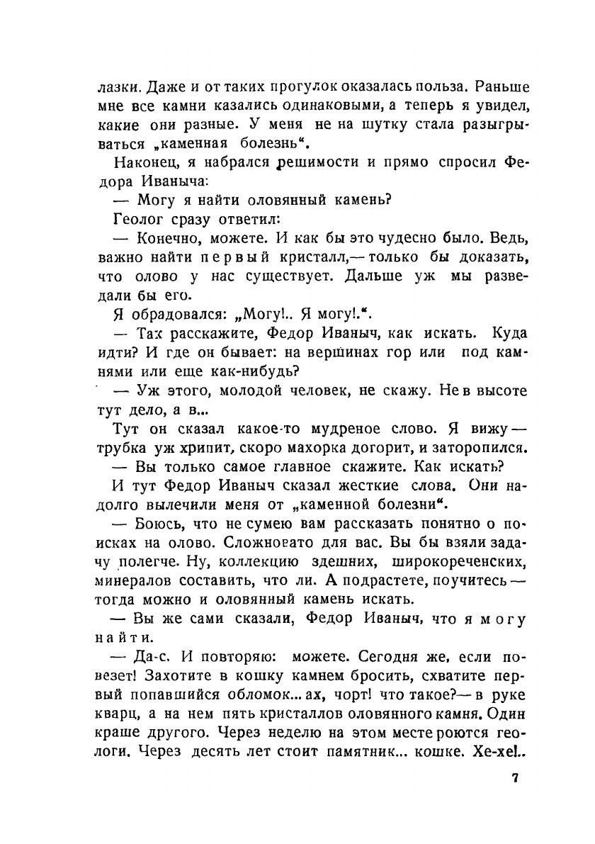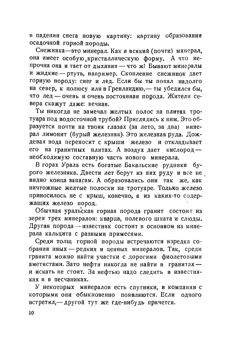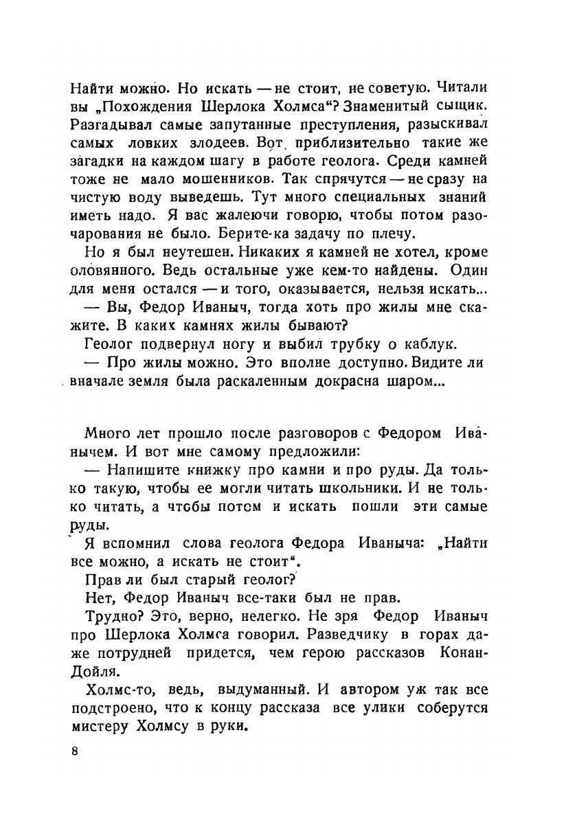 Научно-художественная книга для юных геологов-разведчиков. Книга вооружает читателя необходимыми знаниями для того, чтобы самостоятельно разобраться в геологическом строении местности, найти обнажения горных пород, опробовать россыпь, взять образец и документировать свою разведочную работу. Книга учит находить следы прошлой жизни в слоях земной коры и хранить найденные окаменелости. В приложении дается описание тех минералов, которые или наиболее широко распространены или являются особенно нужными промышленности. Указаны простейшие способы определения минералов, геологические признаки залегания полезных ископаемых и использование их в промышленности.