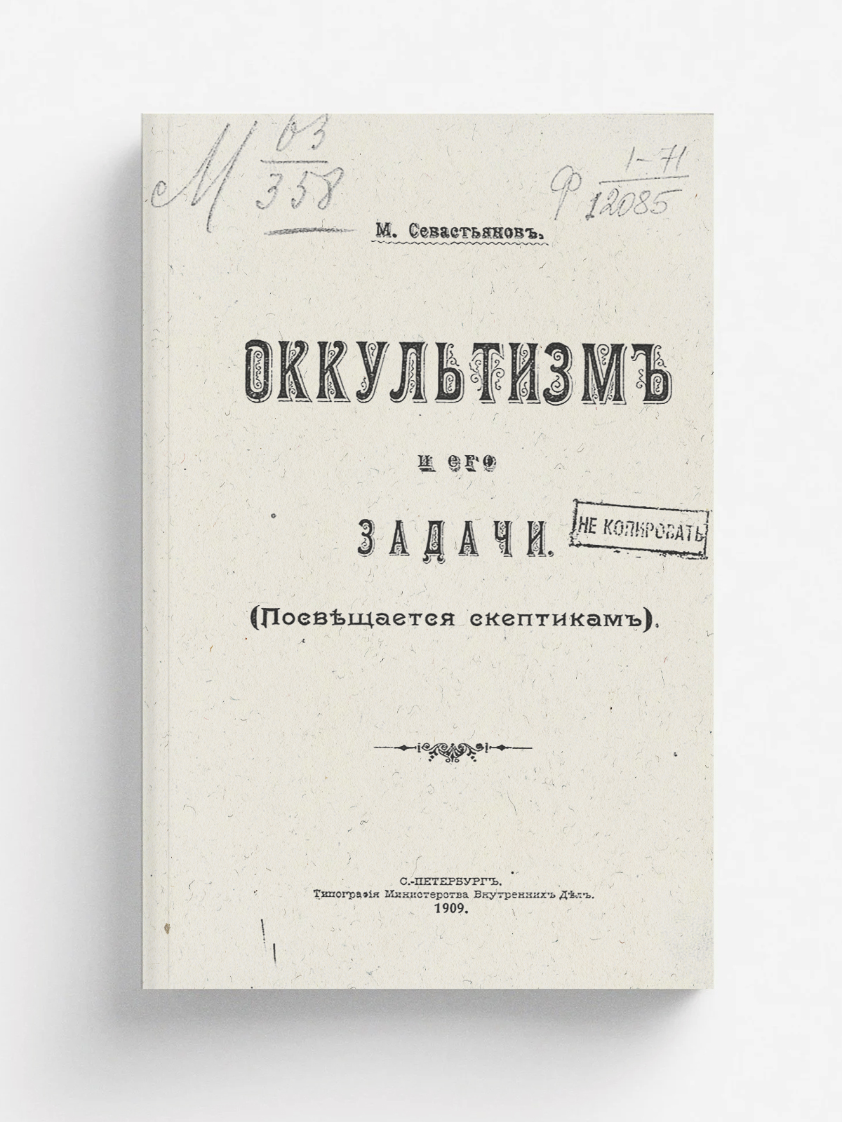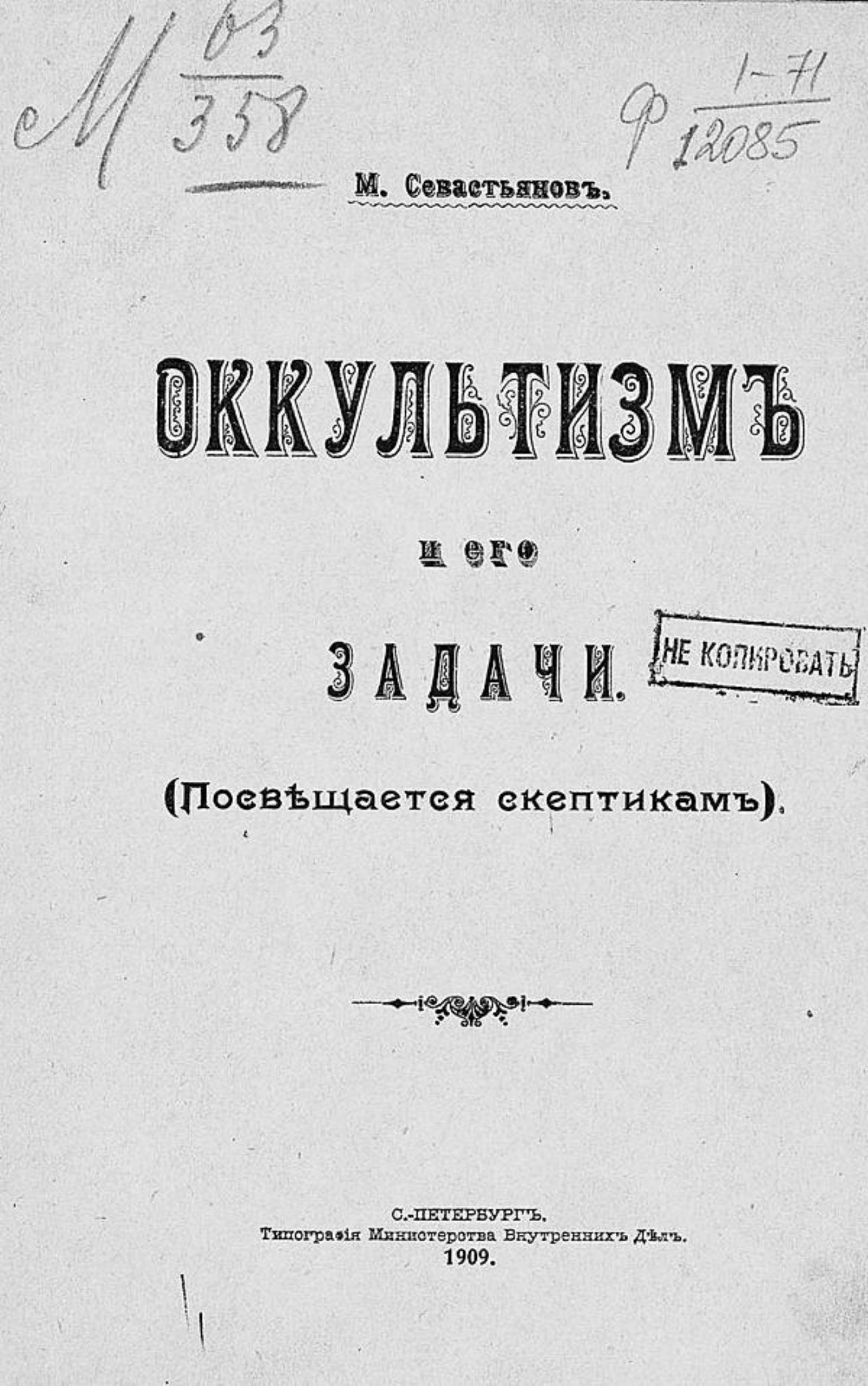 Севастьянов, М. Оккультизм и его задачи : (Посвящается скептикам) / М. Севастьянов. — Санкт–Петербург : тип. М–ва вн. дел, 1909. — 51 с.; 22.