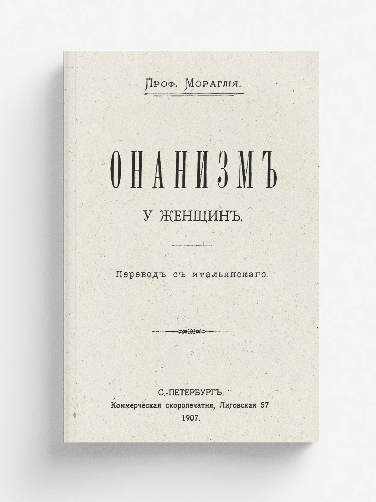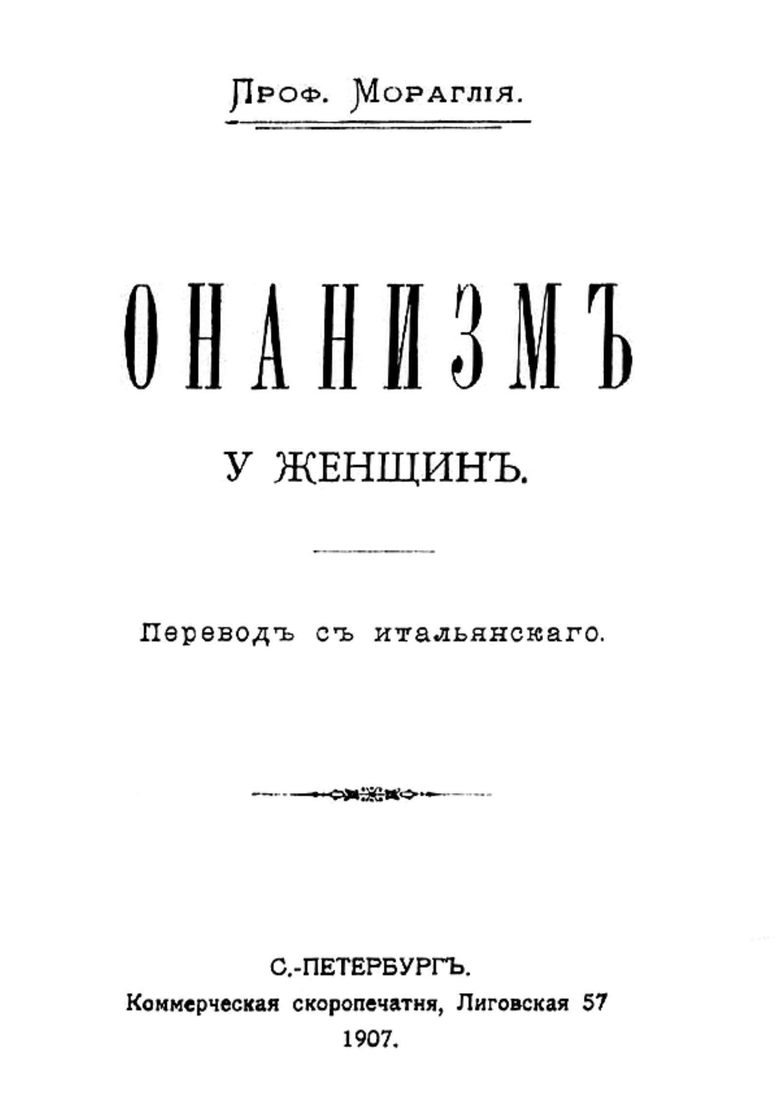 Мораглия, Г. Б. Онанизм у женщин : Пер. с итал. / Проф. Мораглия. — Санкт-Петербург : Коммерческая скоропечатня, 1907. — 32 с.; 18.